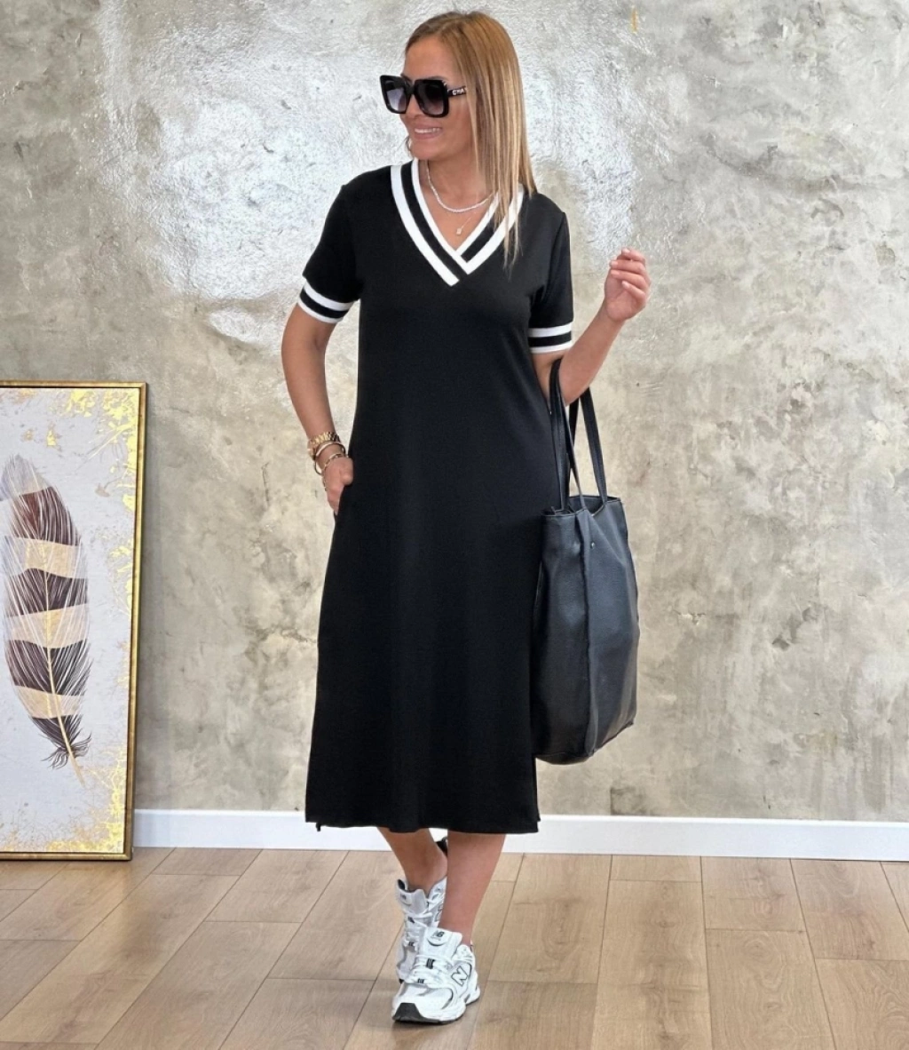 Kadın Kısa Kollu V Yaka Kol Ve Yaka Ribana Detay Midi Boy Viskon Elbise