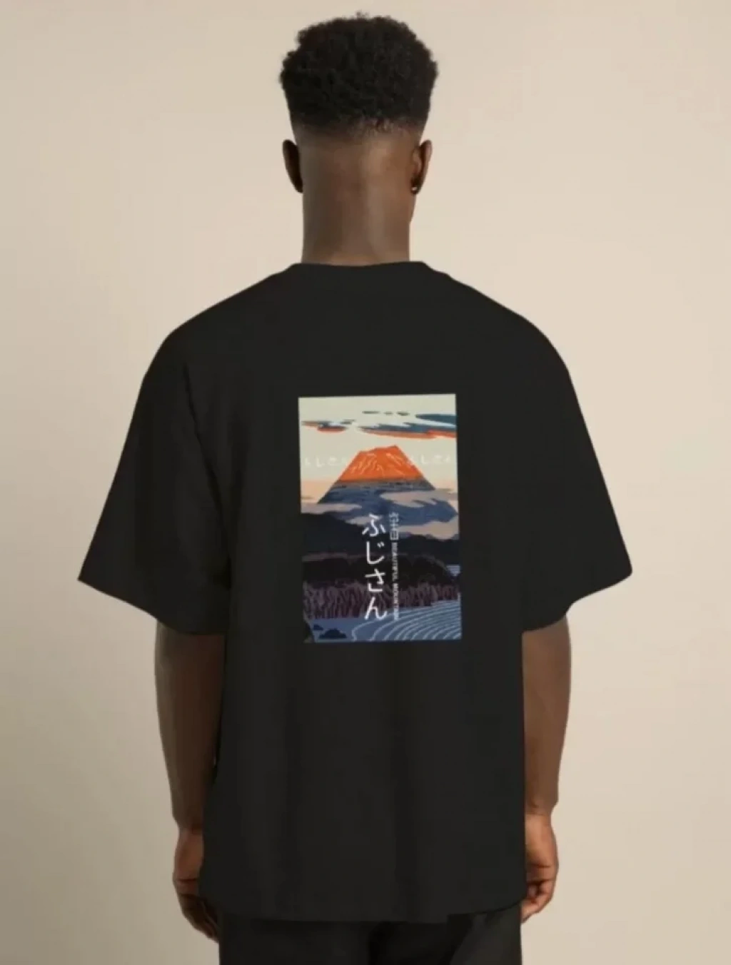 Unisex Bisiklet Yaka Baskılı Oversize T-Shirt - Siyah