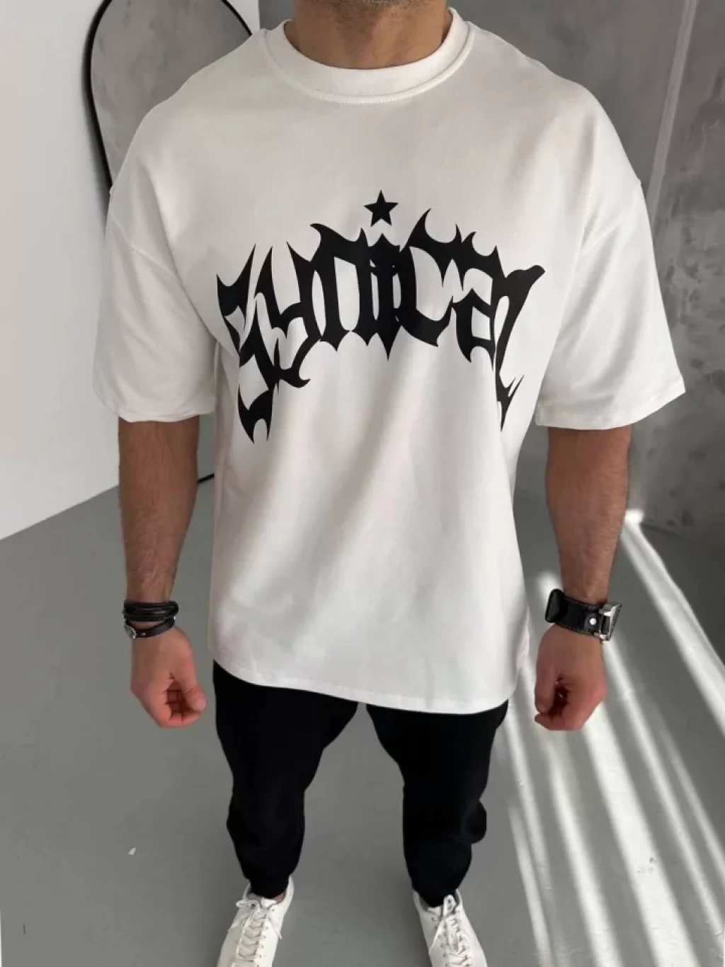 Unisex Bisiklet Yaka Baskılı Oversize T-Shirt - Beyaz
