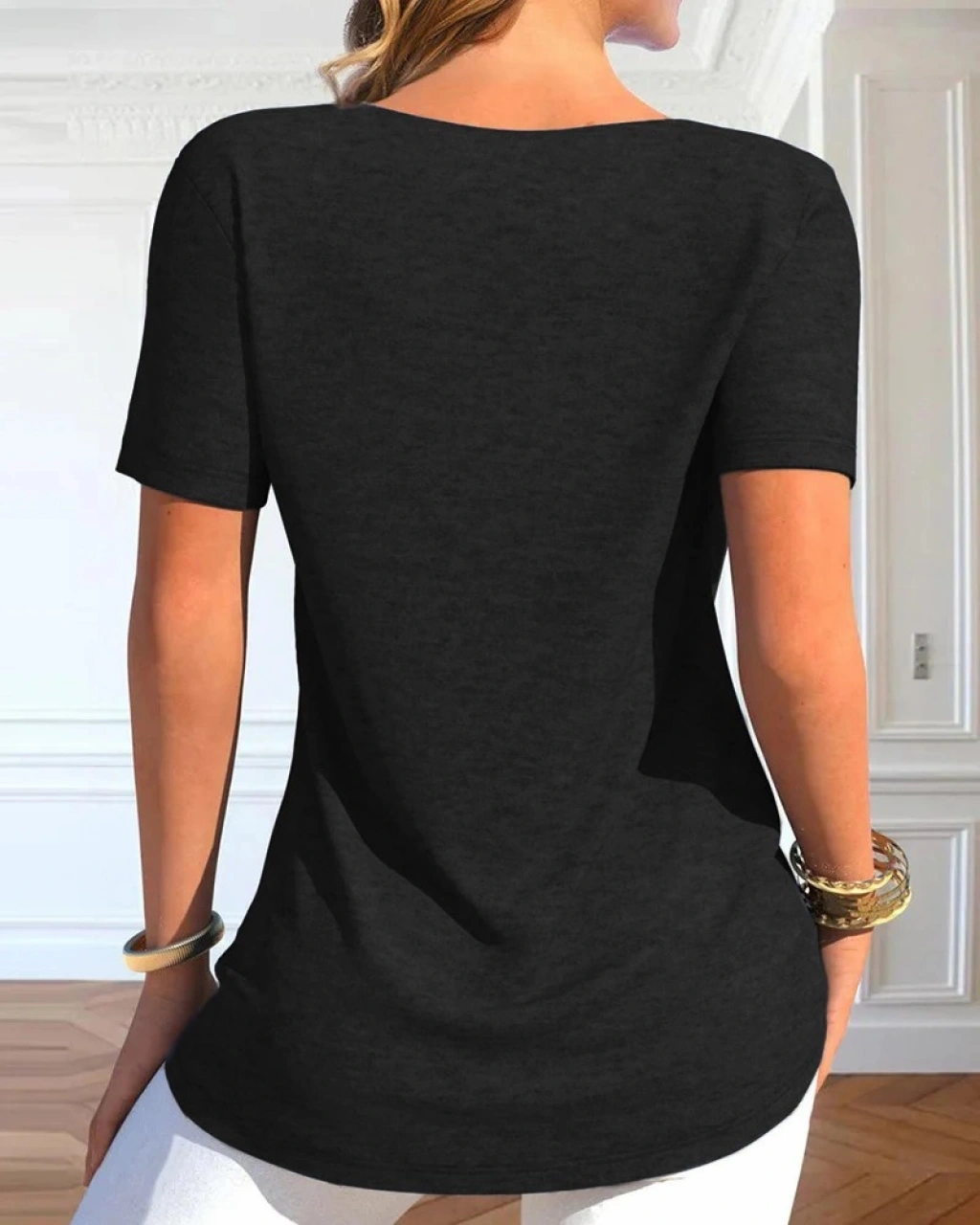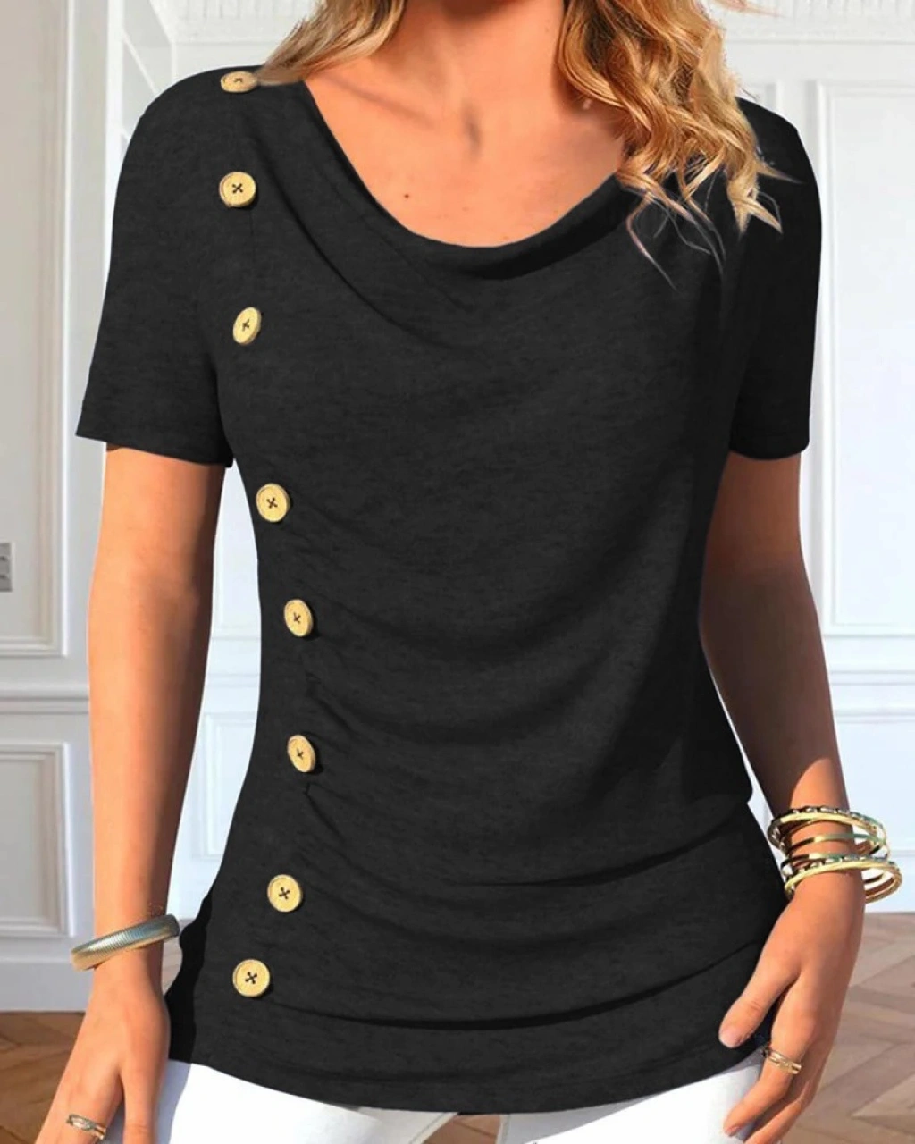 Kadın Kısa Kollu Degaje Yaka Düğme Detay Viskon Bluz