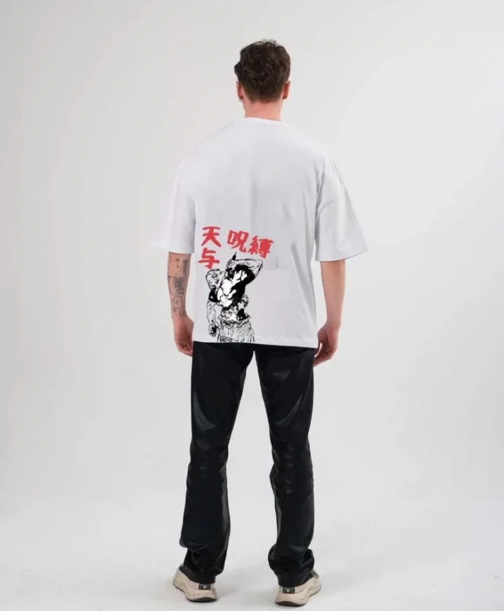 Unisex Bisiklet Yaka Baskılı Oversize T-Shirt - Beyaz