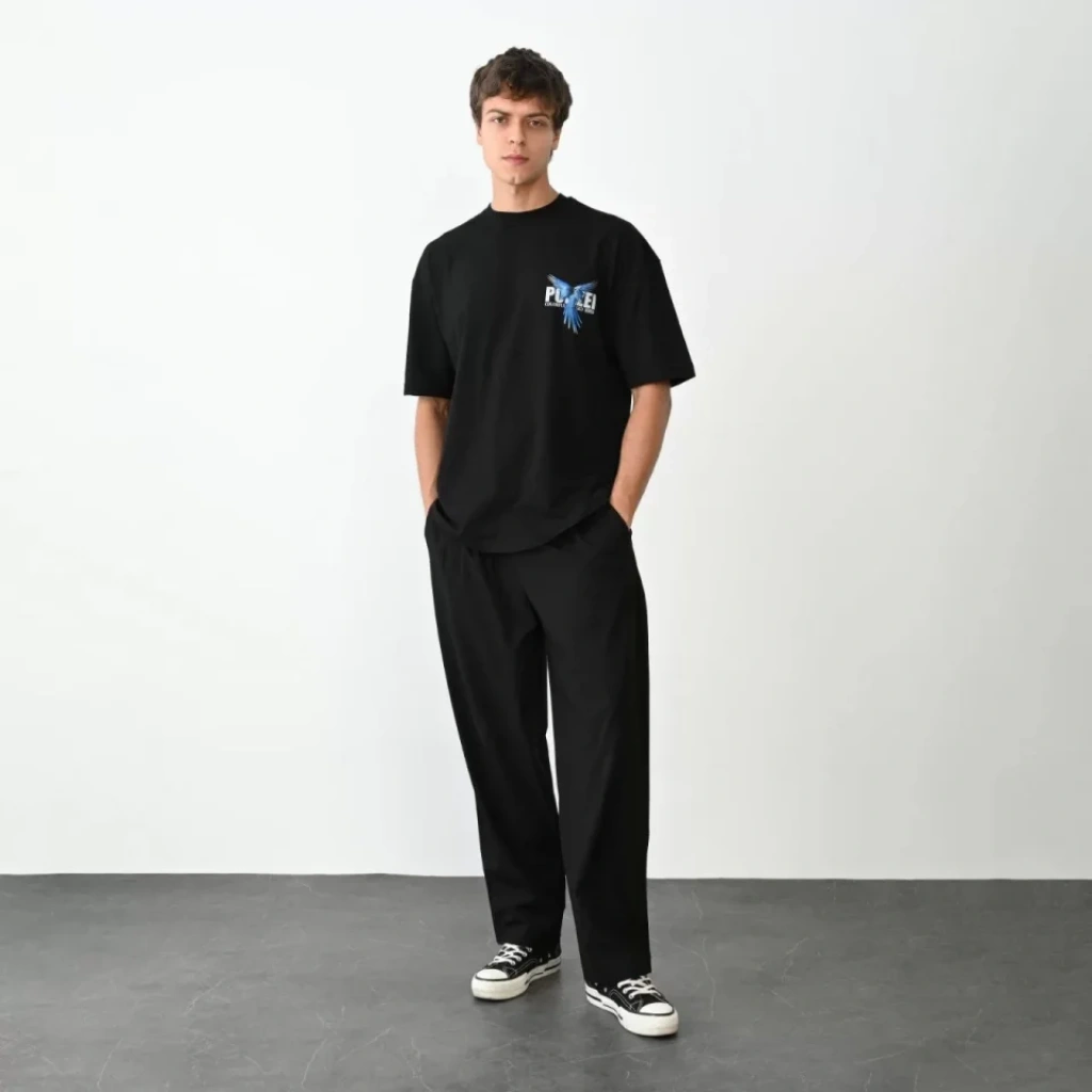 Unisex Bisiklet Yaka Baskılı Oversize T-Shirt - Siyah