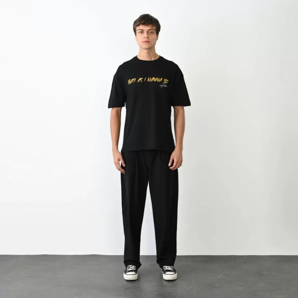 Unisex Bisiklet Yaka Baskılı Oversize T-Shirt - Siyah