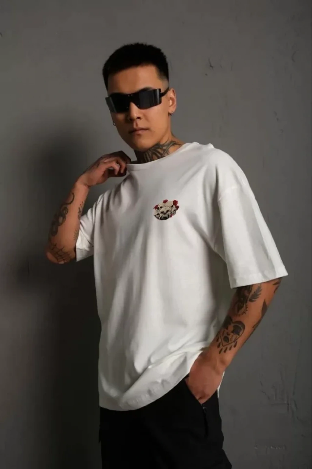 Unisex Bisiklet Yaka Baskılı Oversize T-Shirt - Beyaz
