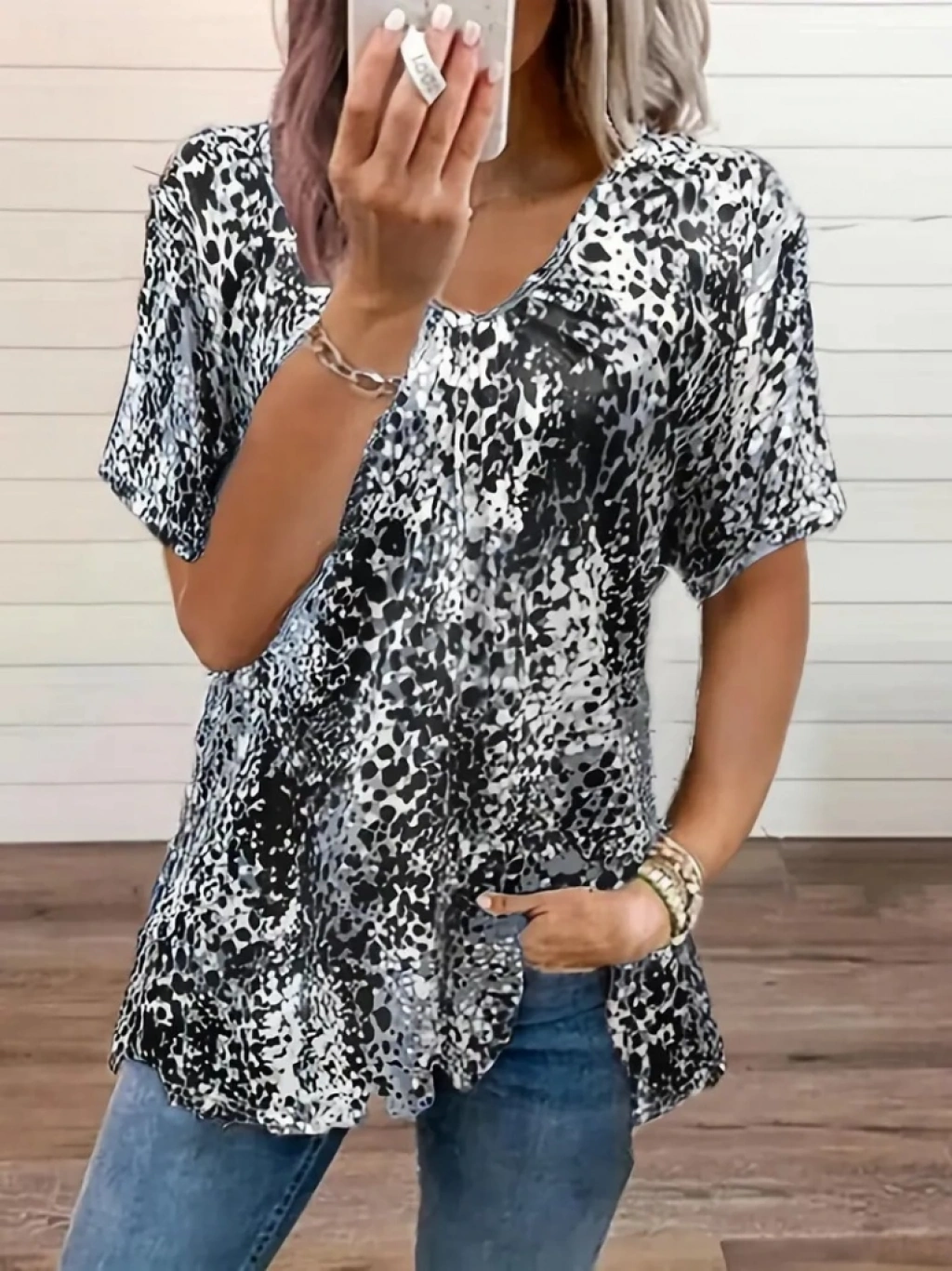 Kadın V Yaka Renkli Leopar Desen Büzgü Detay Süprem Bluz