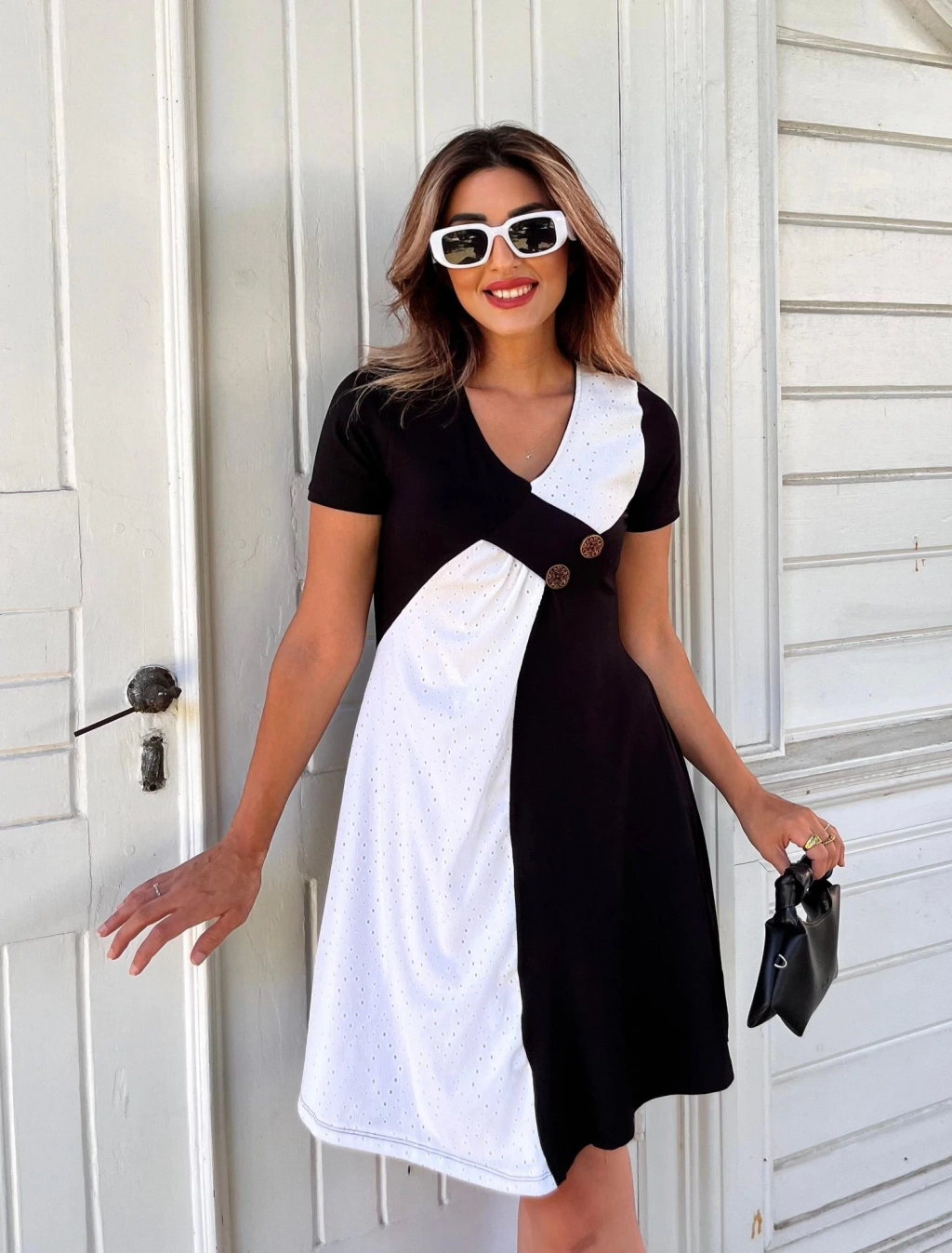Kadın Kısa Kollu V Yaka Asimetrik Siyah Beyaz Geçişli Diz üstü Elbise