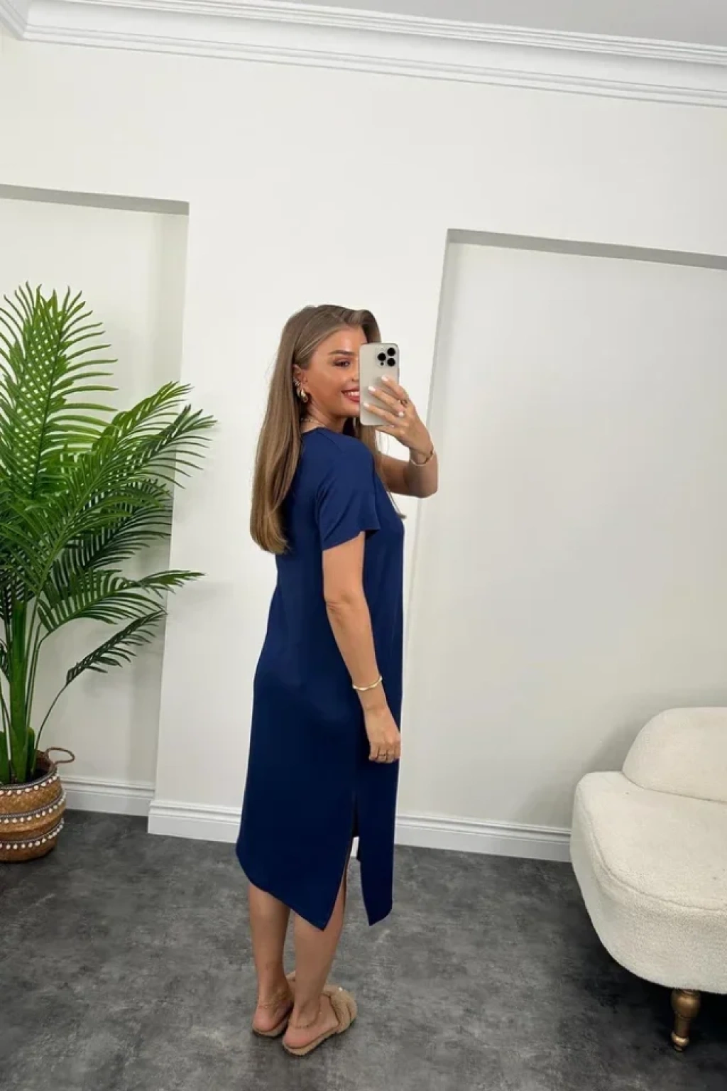 Kadın Kısa Kollu Yırtmaç Detaylı Salaş Viskon Elbise