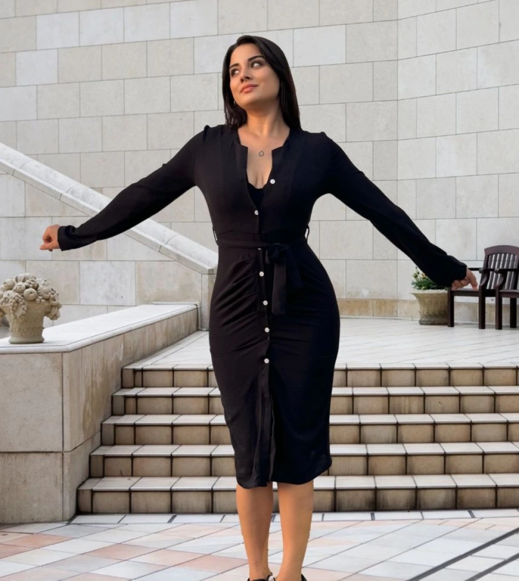 Kadın Uzun Kollu önden Düğmeli Beli Kuşaklı Aerobin Midi Elbise