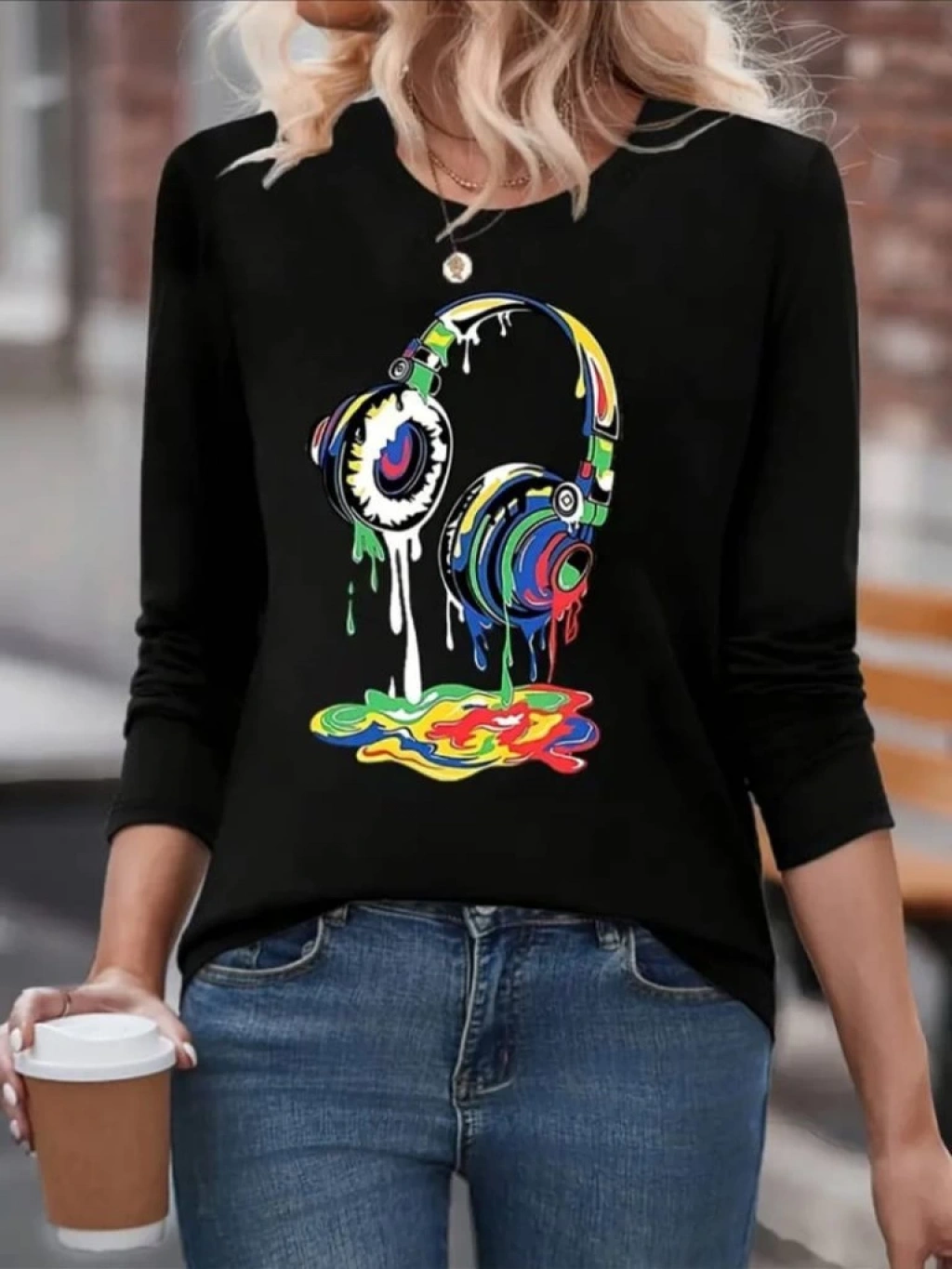 Kadın Uzun Kollu Bisiklet Yaka Baskılı Iki Iplik Bluz