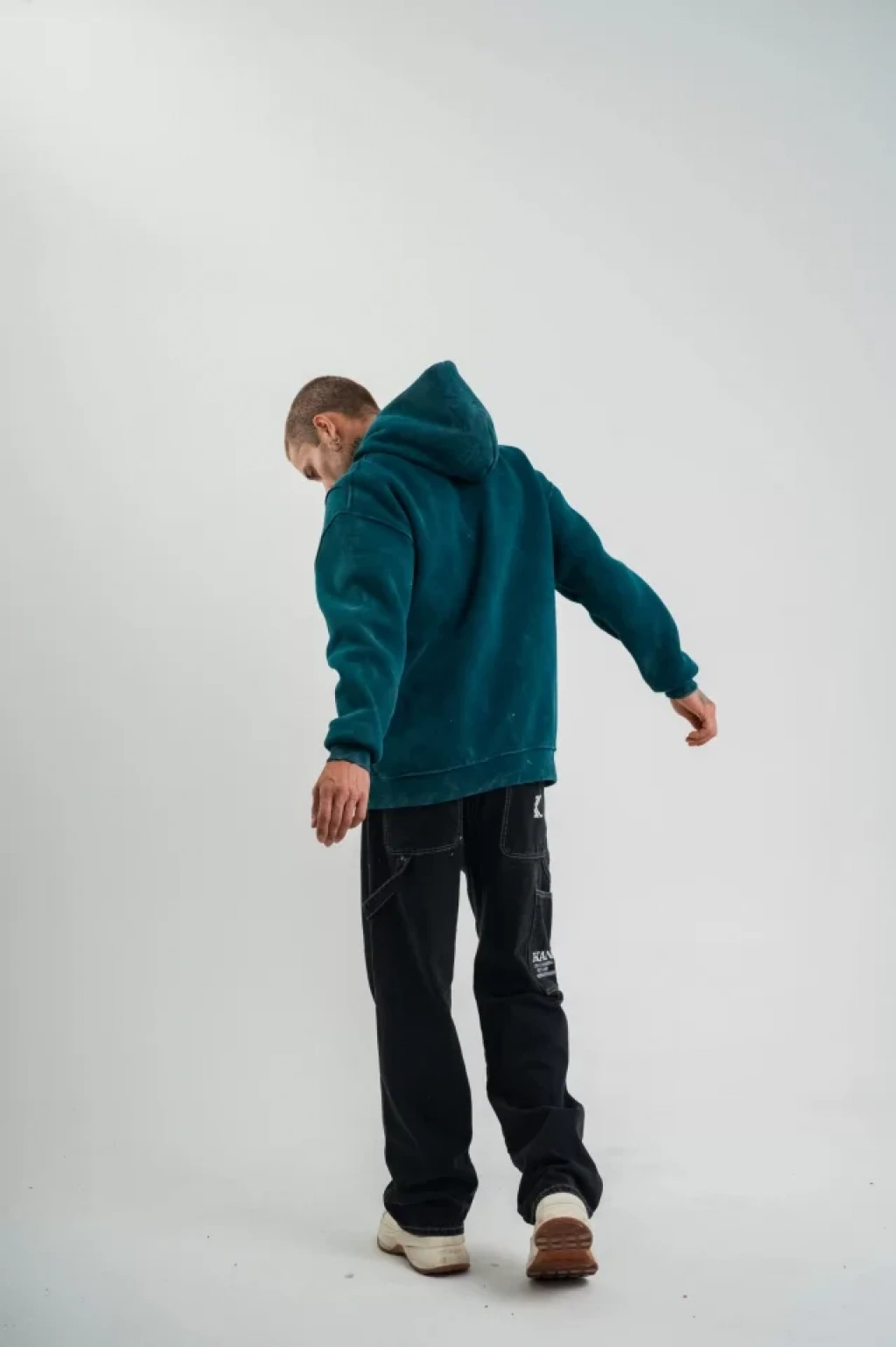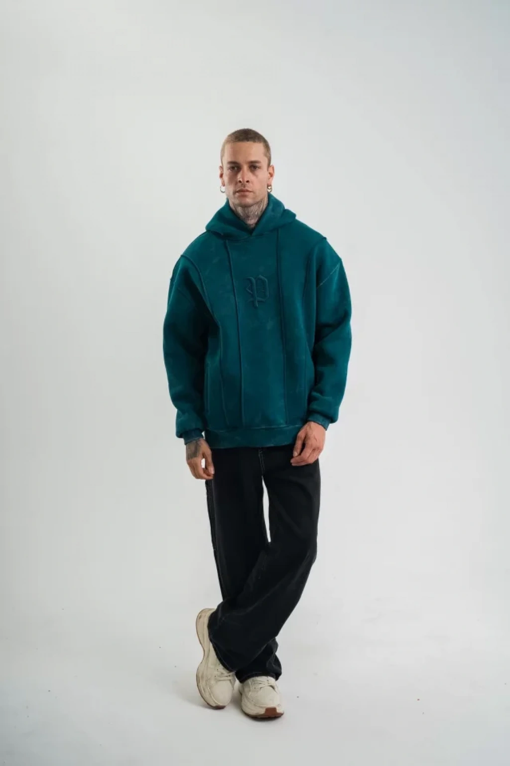 Unisex Uzun Kol Kapşonlu Yıkamalı Nakışlı SweatShirt - Koyu Deniz Yeşili