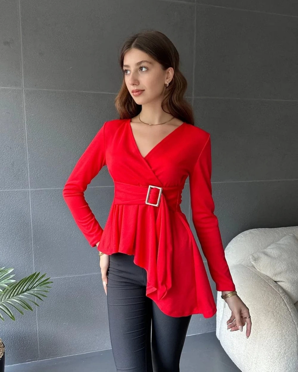 Kadın Kruvaze Yaka Kemer Detay Asimetrik Kesim Bluz