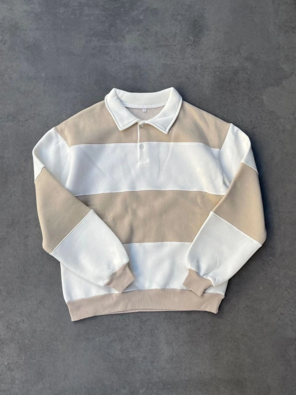 Unisex Üç İplik Parçalı Yakalı SweatShirt - Bej