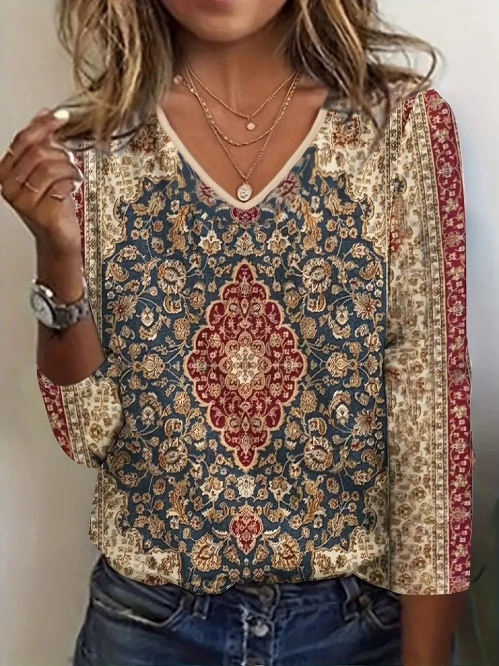 Kadın Truvakarkollu V Yakalı Etnik Desenli Süprem Bluz