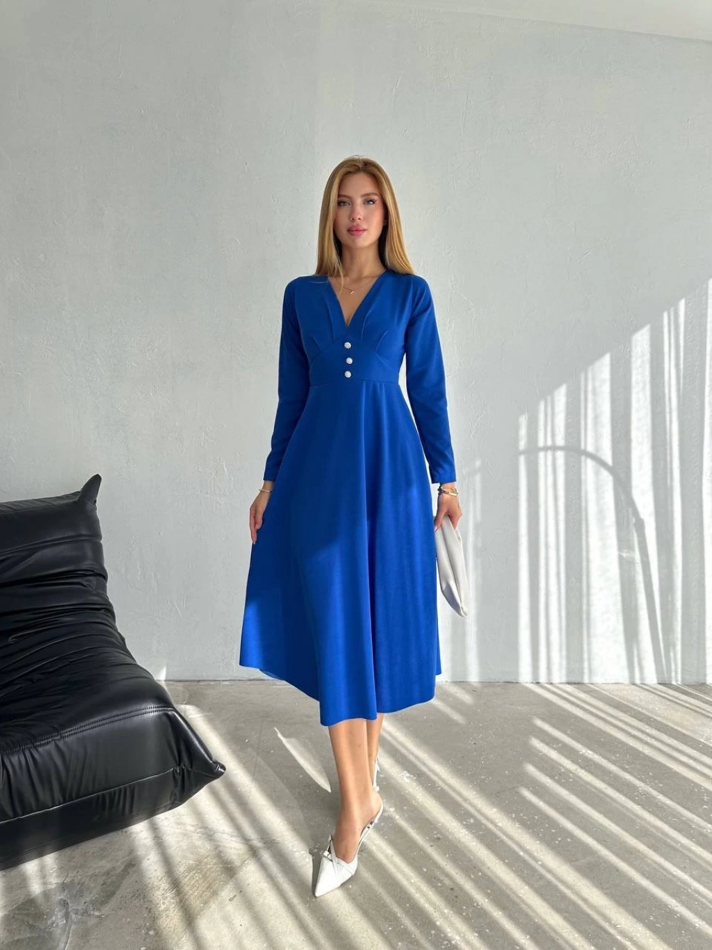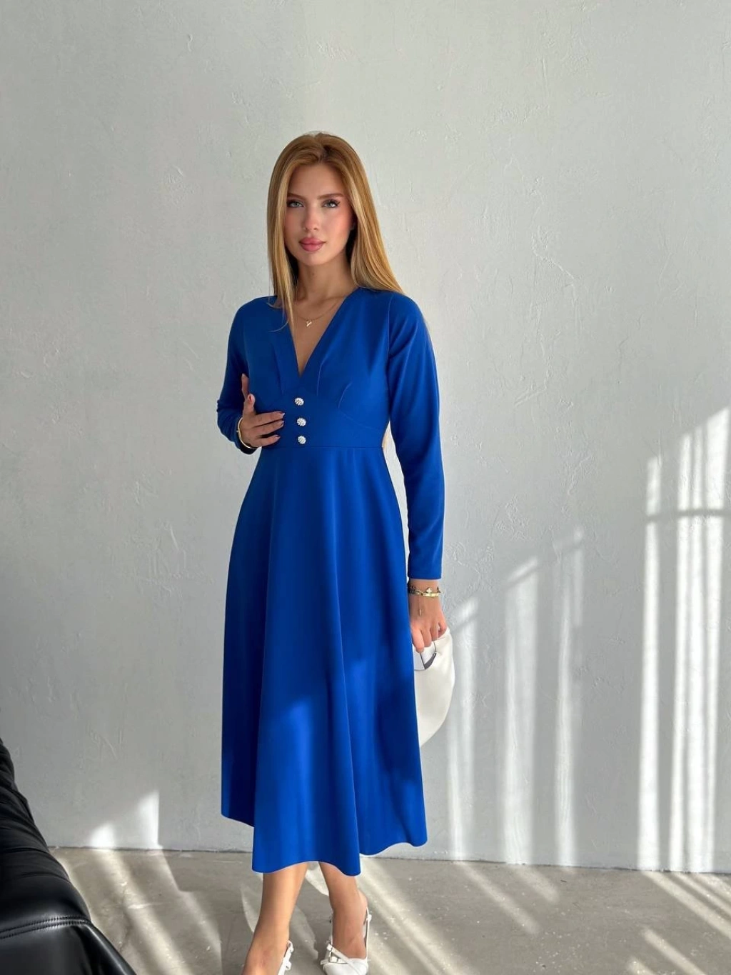 Kadın Krep Kumaş Düğme Detaylı V Yaka Uzun Kollu Midi Boy Elbise