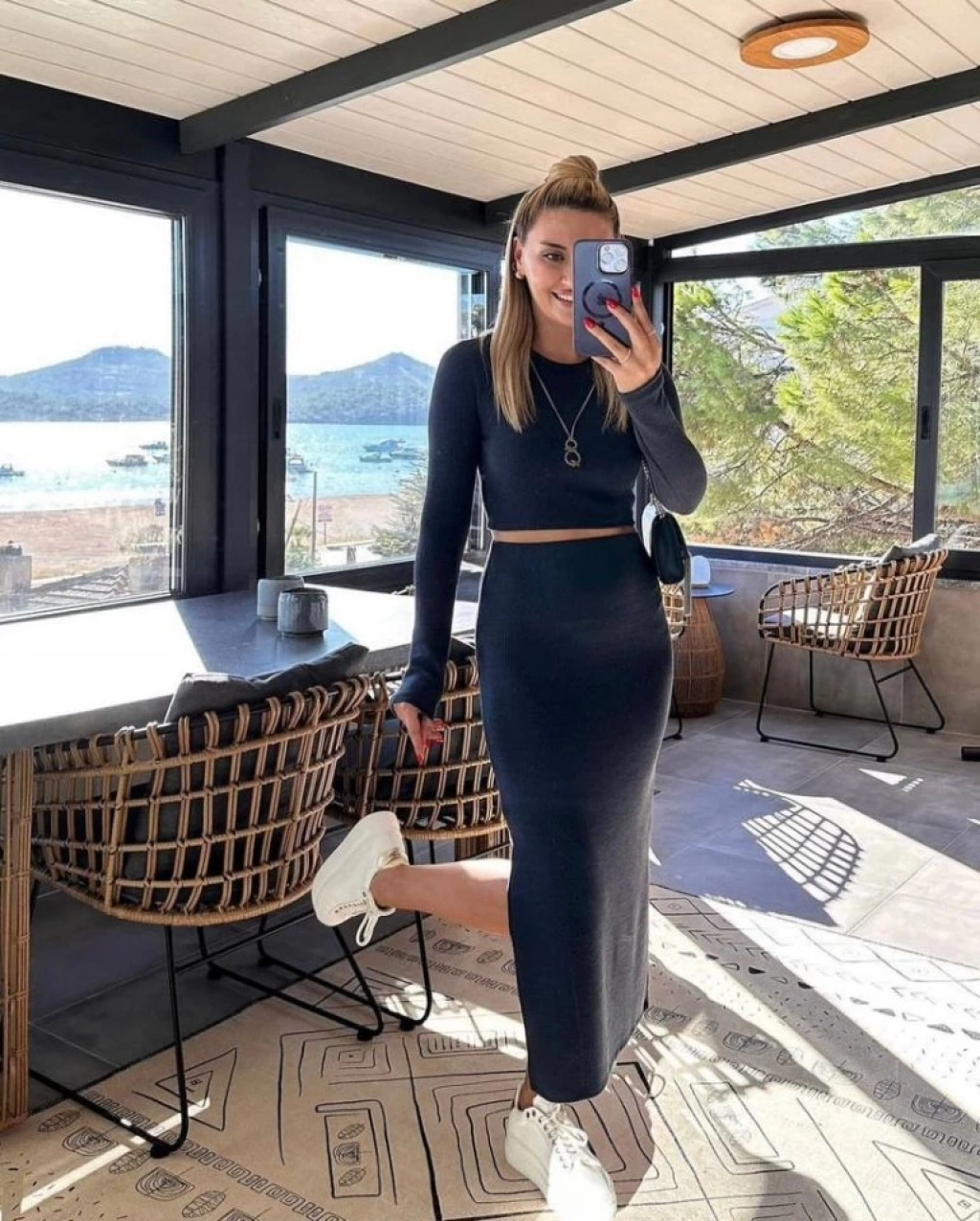 Kadın Soft Kaşkorse Kumaş Bluz Ve Yırtmaç Detaylı Etek Ikili Takım