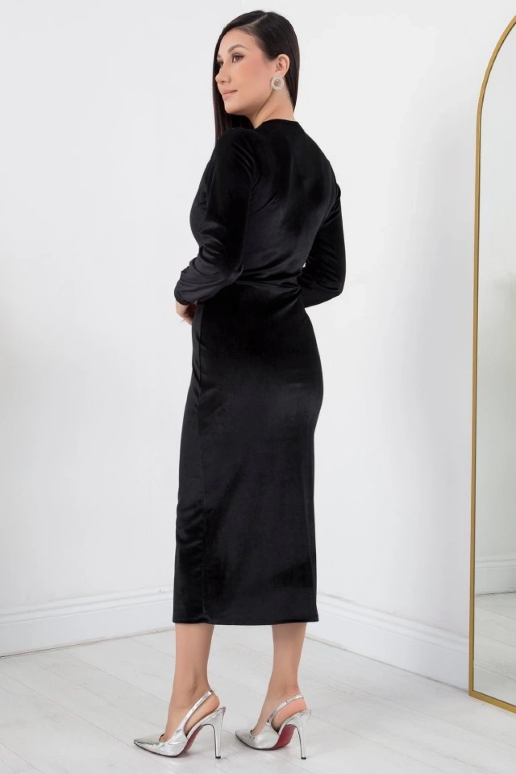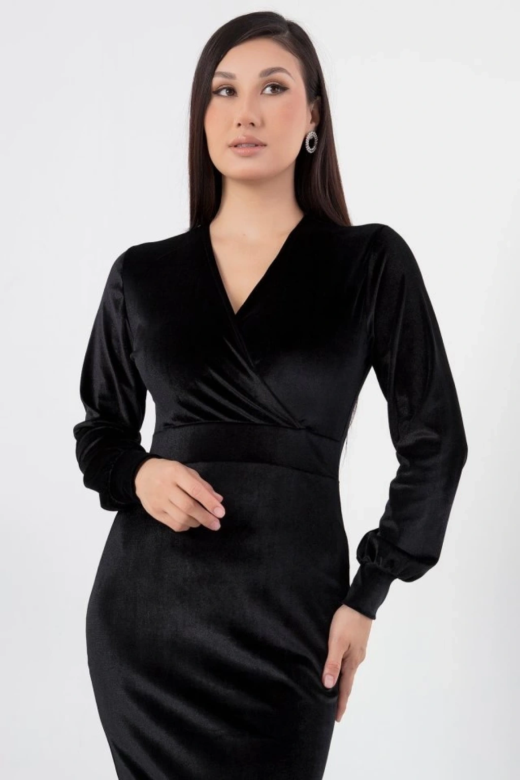 Kadın Kadife Kumaş Manşetli V Yaka Şık Kalem Elbise