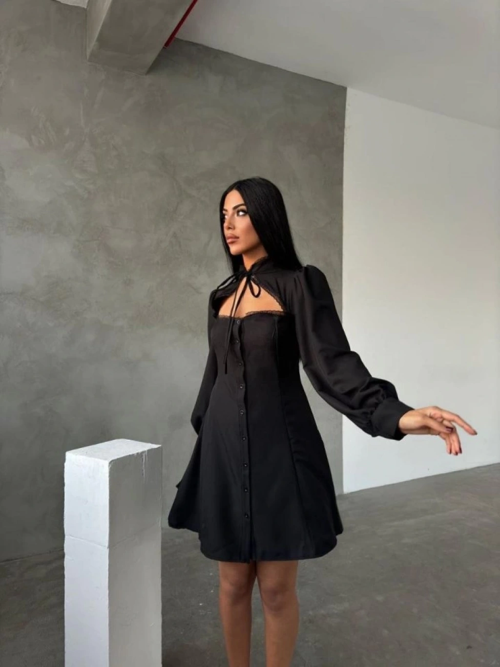 Kadın Uzun Kollu Balıkçı Yaka Göğüs Detay Diz üstü Elbise