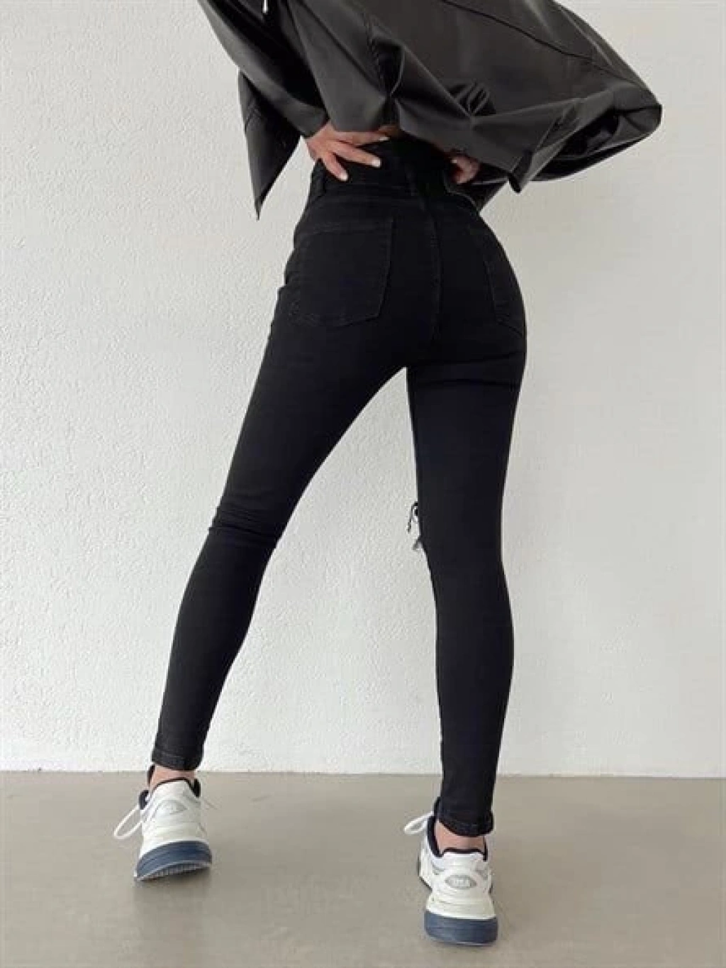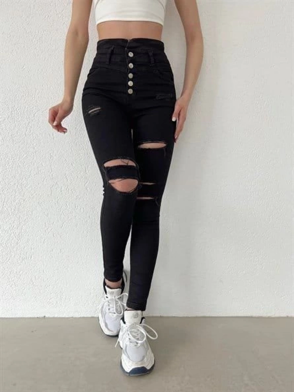 Kadın 5 Düğmeli V Detay Bel Yırtık Kot Pantolon