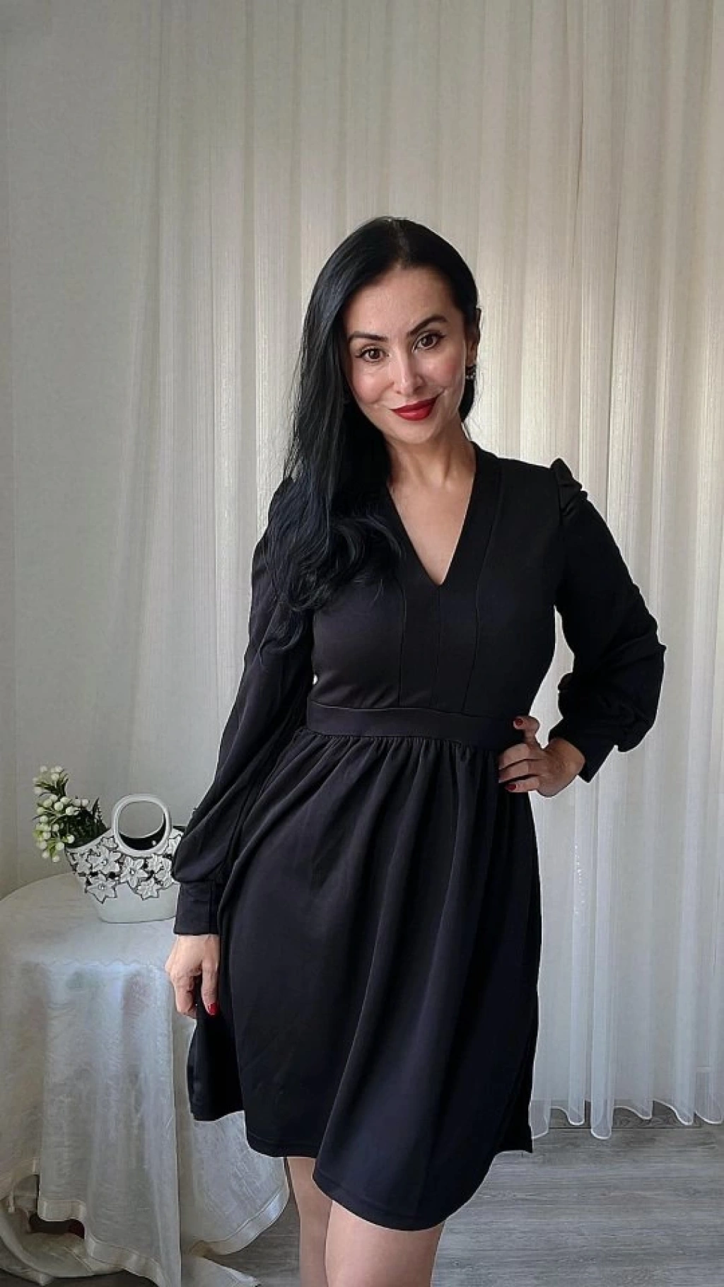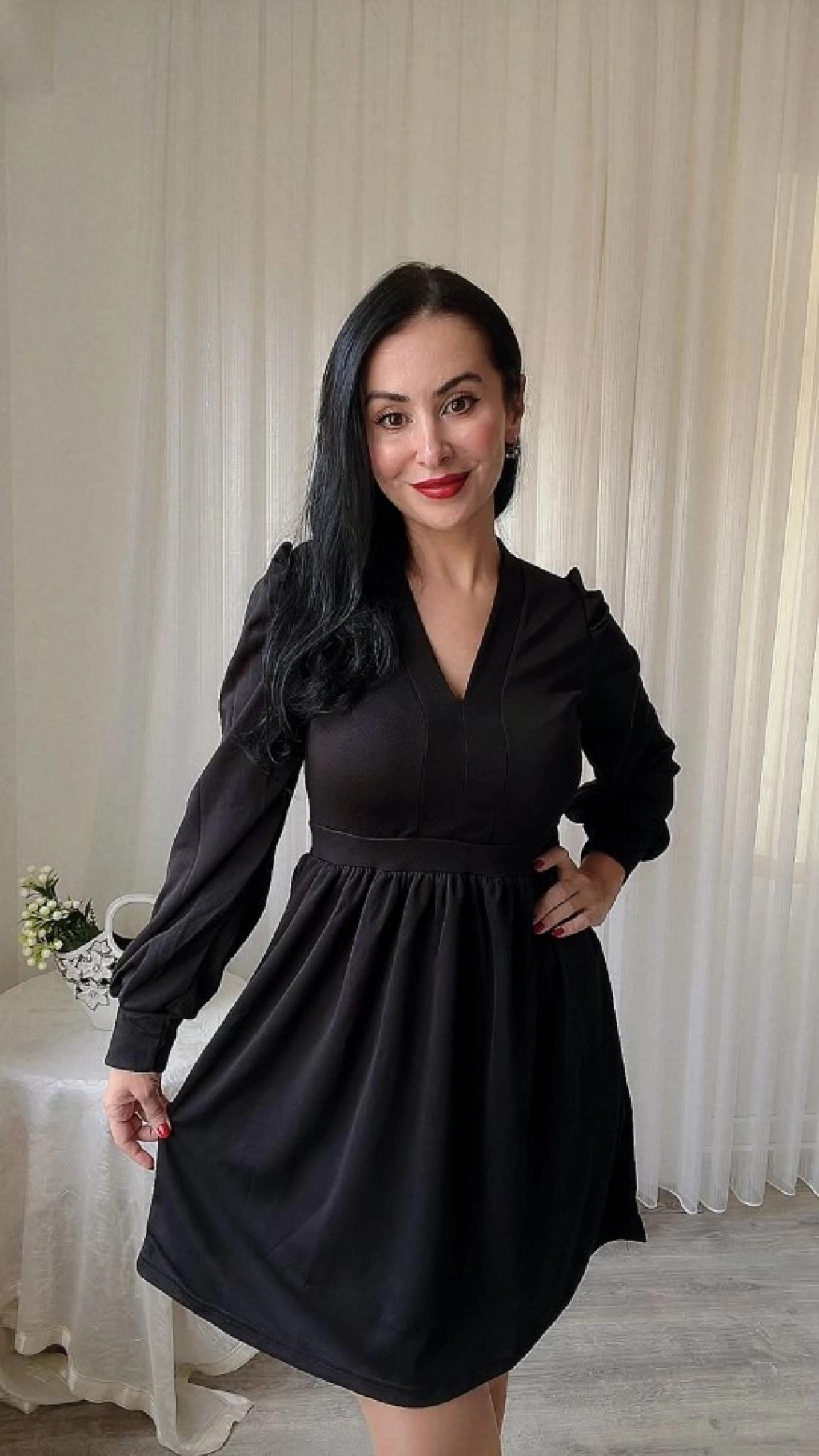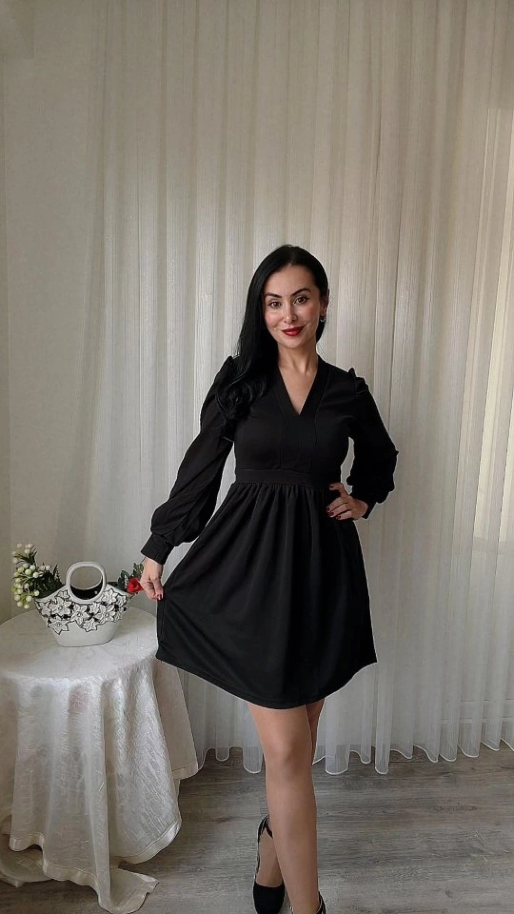 Kadın Uzun Kollu V Yaka Belden Hafif Pileli Scuba Krep Mini Boy Elbise