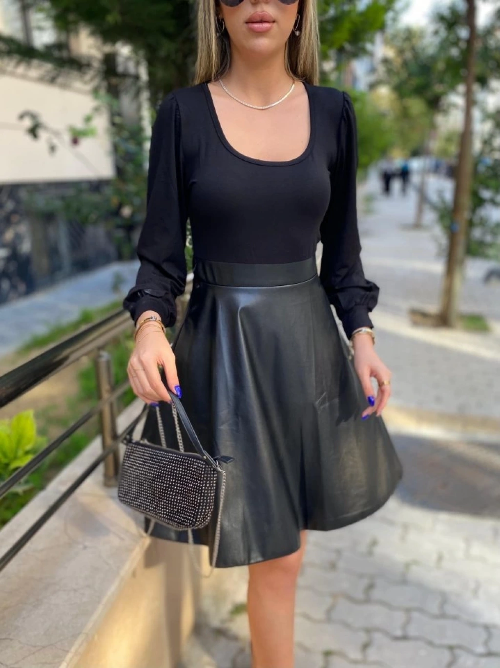 Kadın Uzun Kollu üst Viskon Alt Kloş Deri Elbise