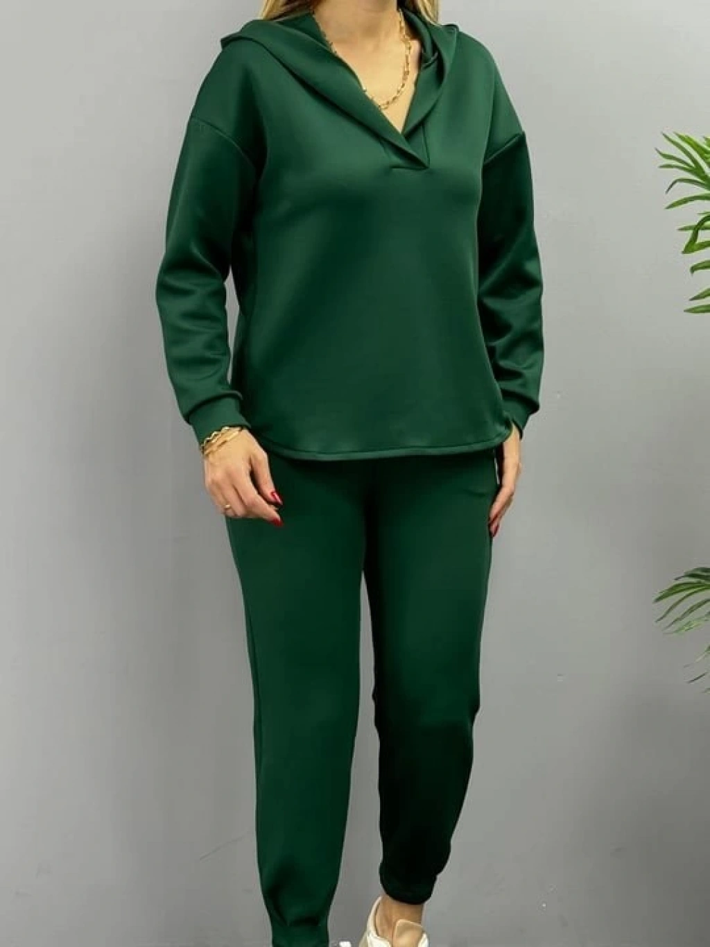 Kadın Uzun Kol V Yaka Kapüşon Detay Sweat Ve Yüksel Bel Eşofman Ikili Takım