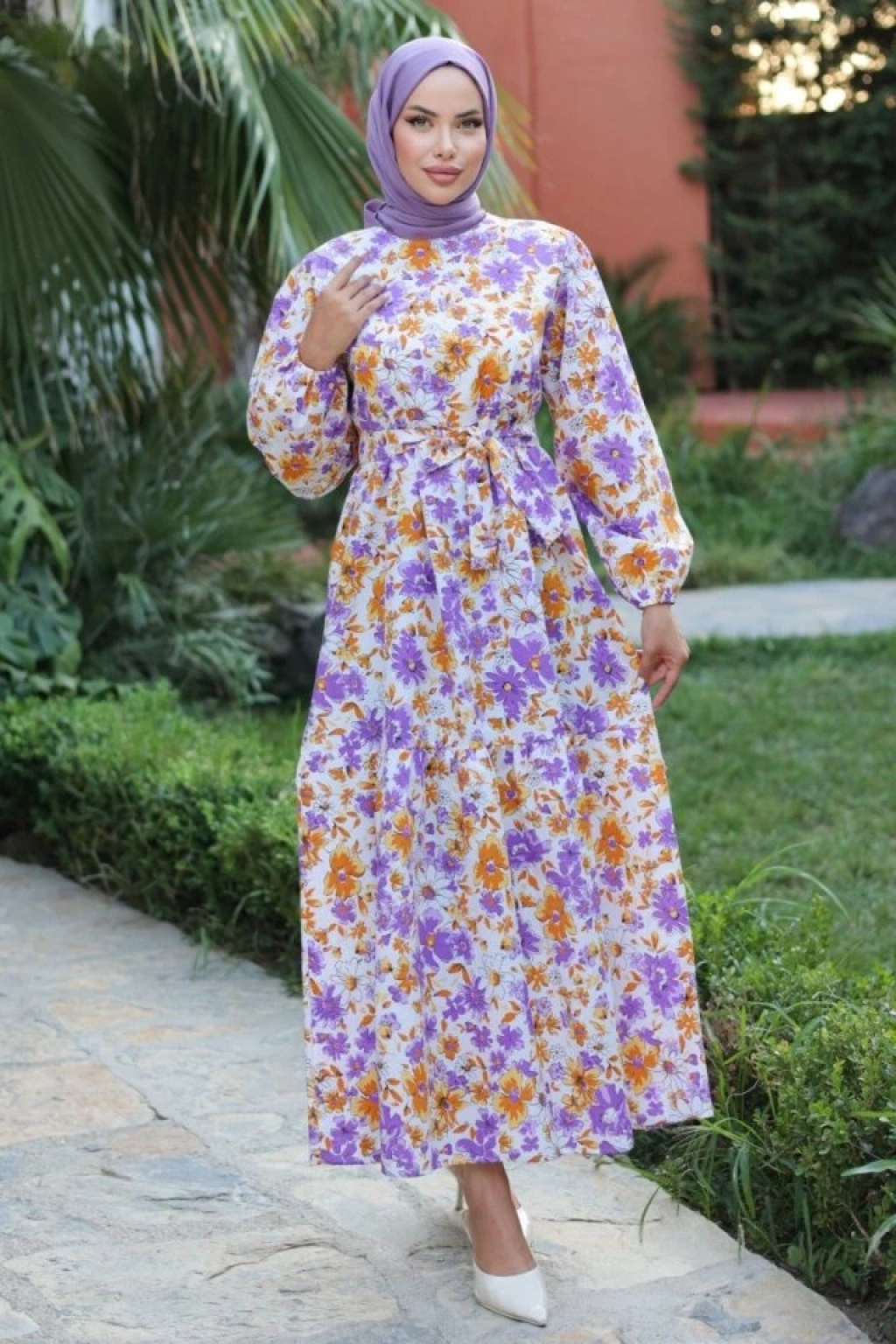 Kadın Uzun Çiçek Yaprak Desenli Belden Bağlamalı Elbise