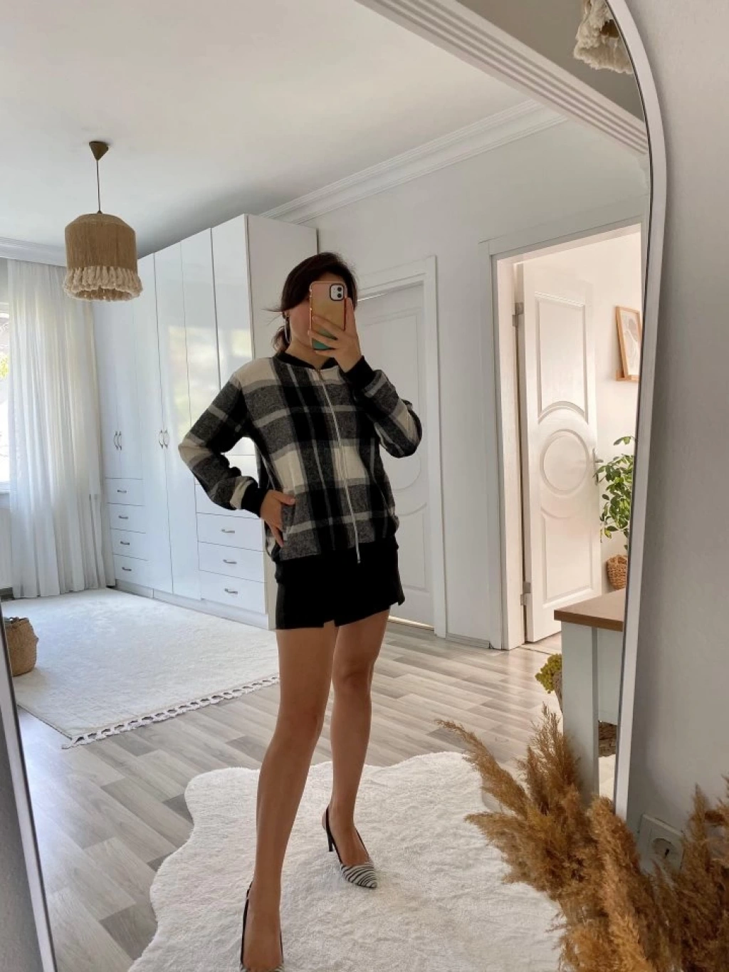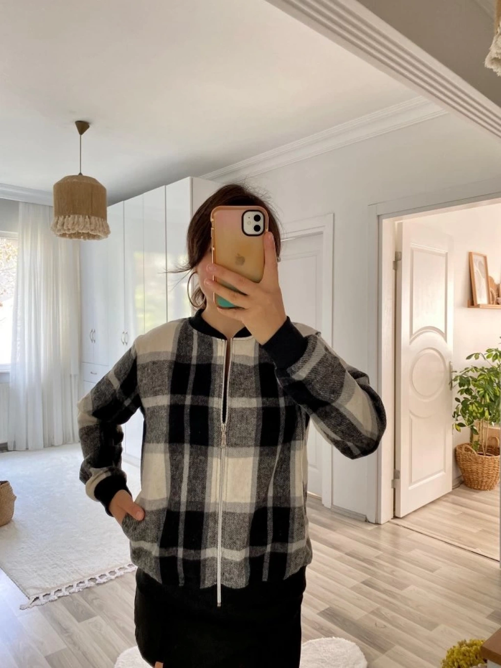 Kadın Uzun Kollu önden Fermuarlı Ekose Desenli Ceket