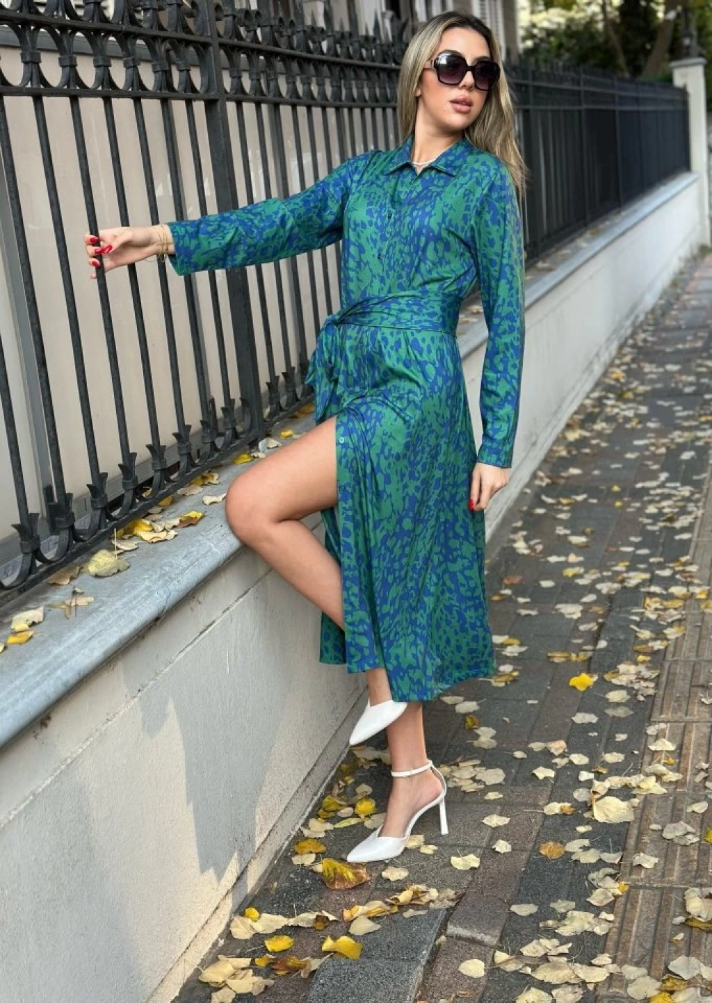 Kadın Uzun Kollu Yakalı önden Düğmeli Beli Kuşaklı Uzun Süprem Elbise