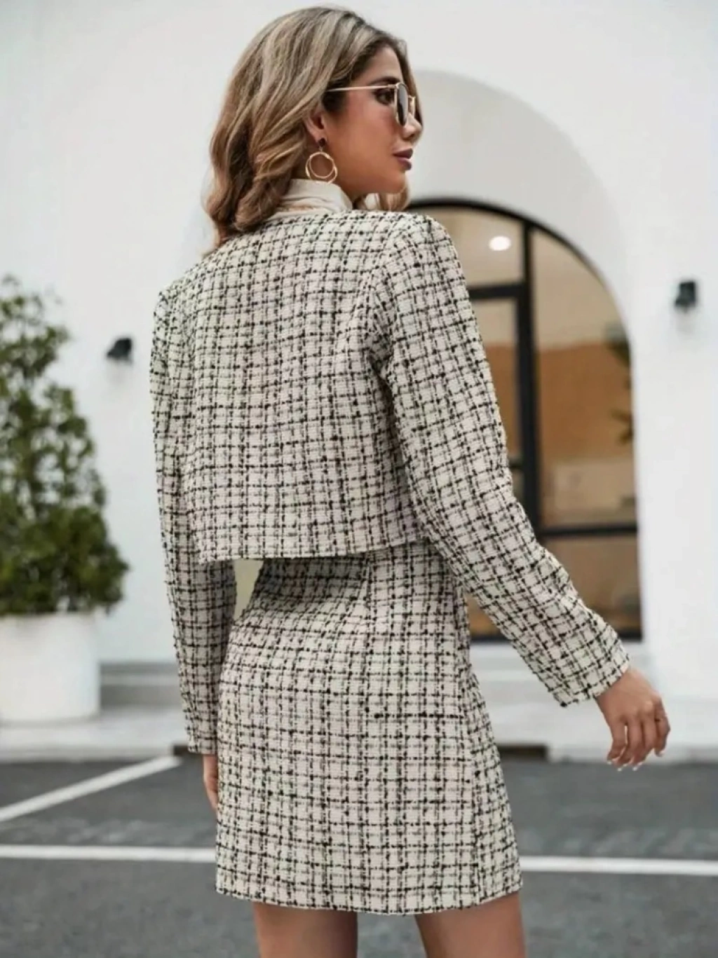 Kadın Uzun Kollu önü Açık Düğme Detaylı Dokuma Ceket Etek Ikili Takım