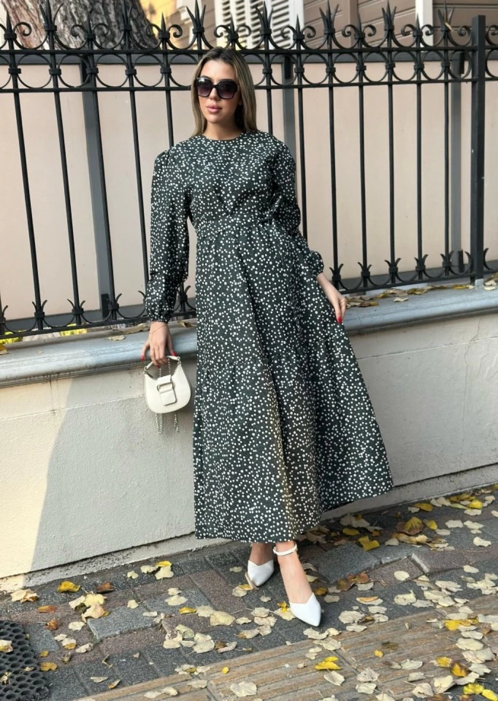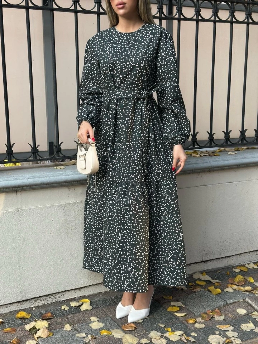 Kadın Uzun Kollu Bisiklet Yaka Papatya Desen Kuşak Dahil Maxi Boy Elbise