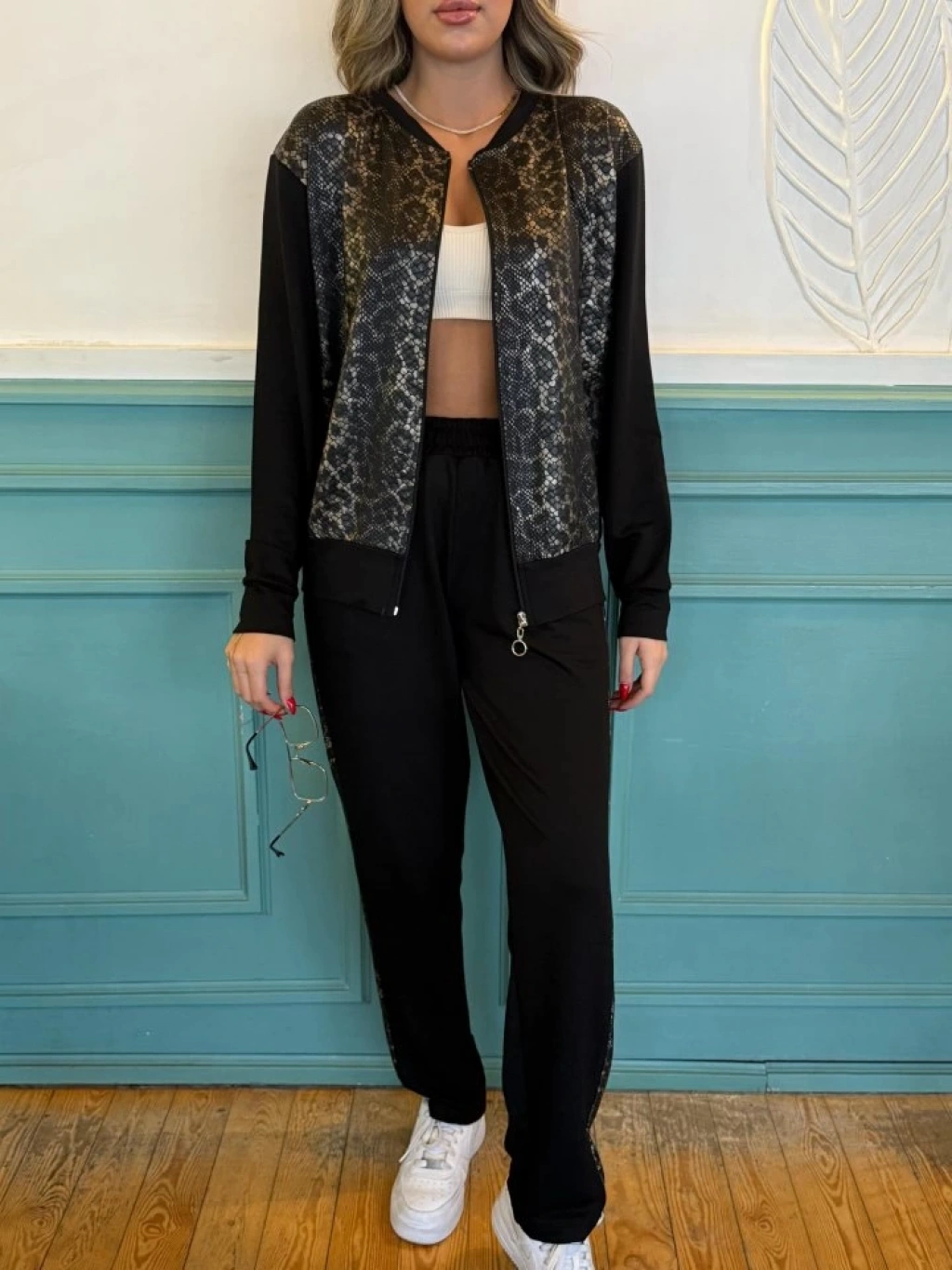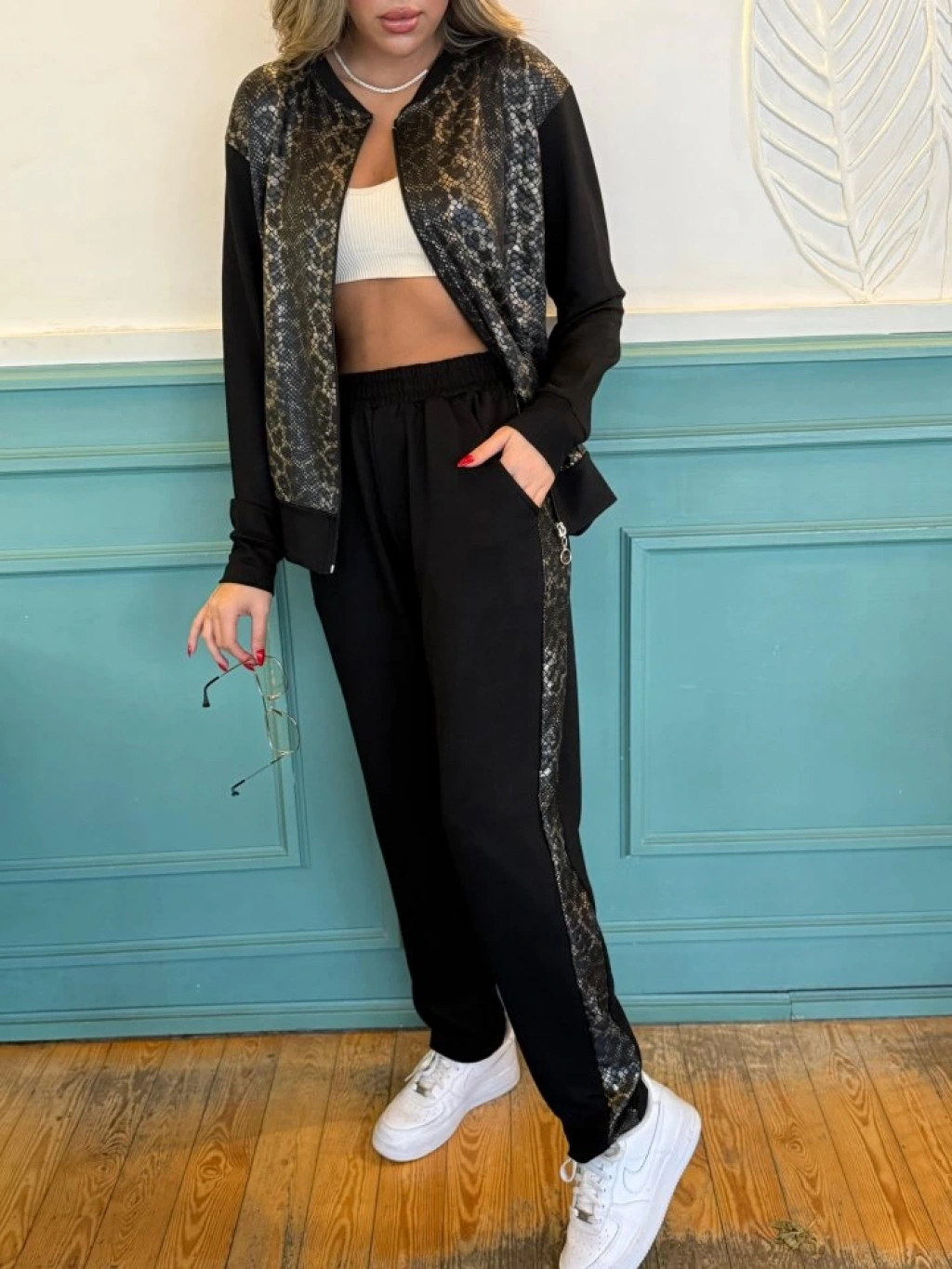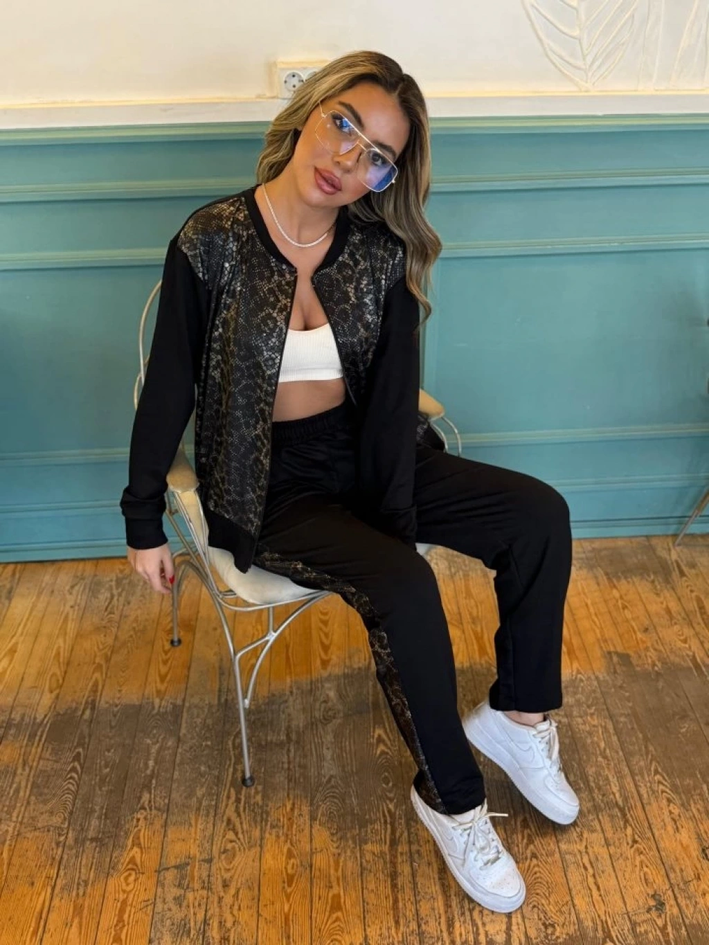 Kadın İki İplik Kumaş Yılan Desenli Fermuarlı İkili Takım