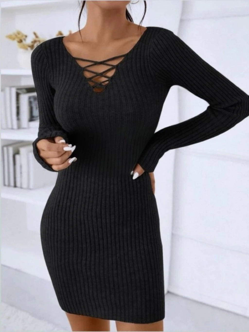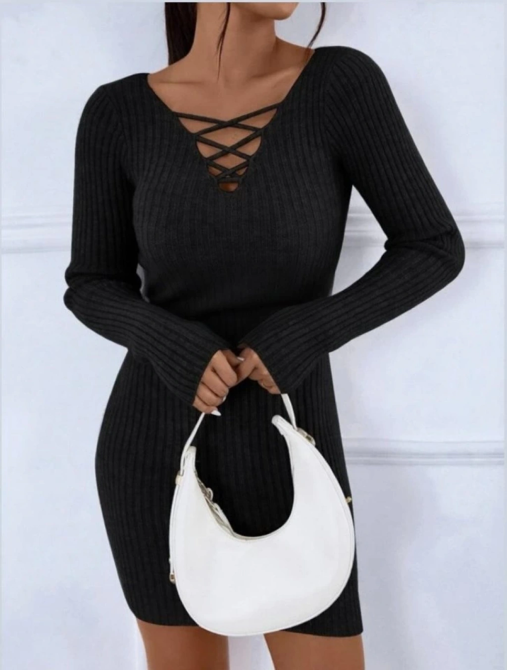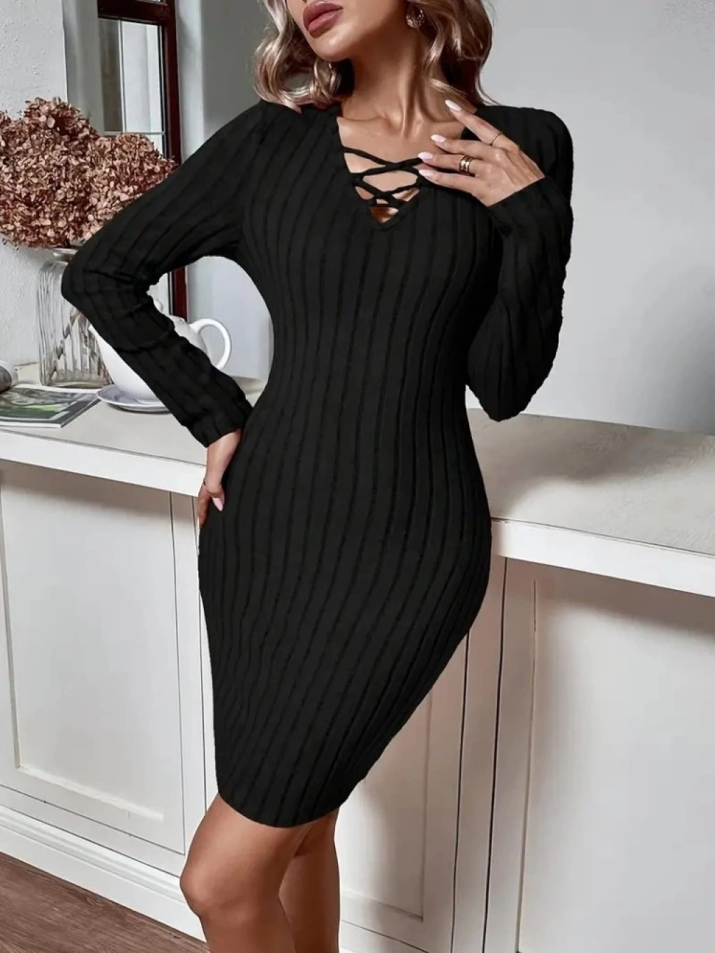 Kadın Uzun Kollu V Yakalı çapraz şerit Detaylı şardonlu Kaşkorse Midi Elbise