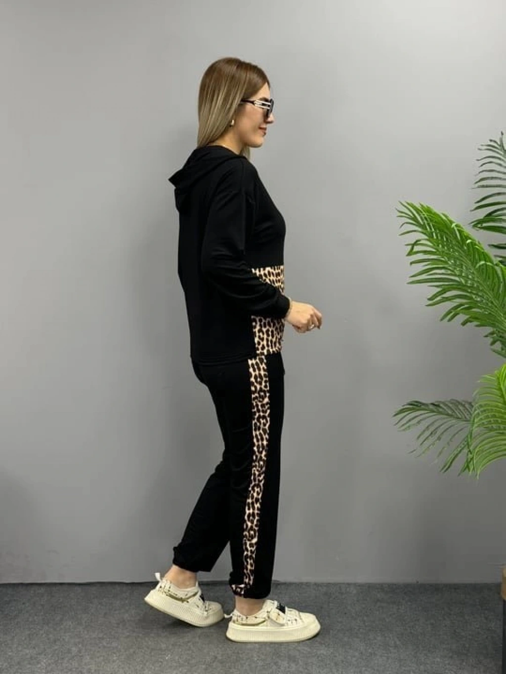Kadın Uzun Kollu Leopar Detay Sweat Ve Yanı Leopar şerit Detay Pantolon Ikili Takım
