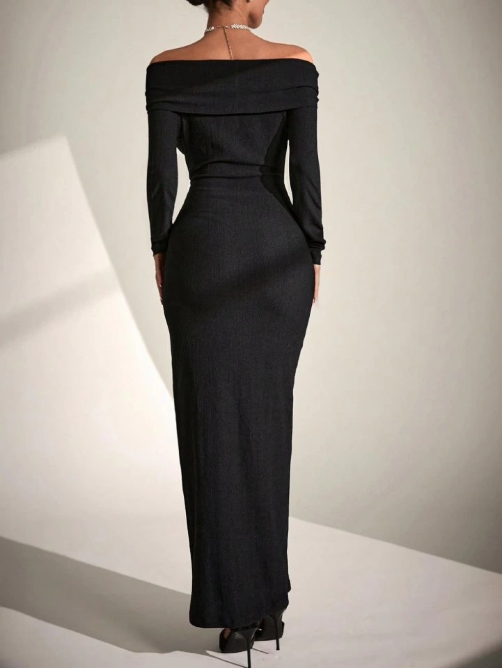 Kadın Uzun Kollu Madonna Yaka Bürümcük Kumaş Maxi Boy Elbise
