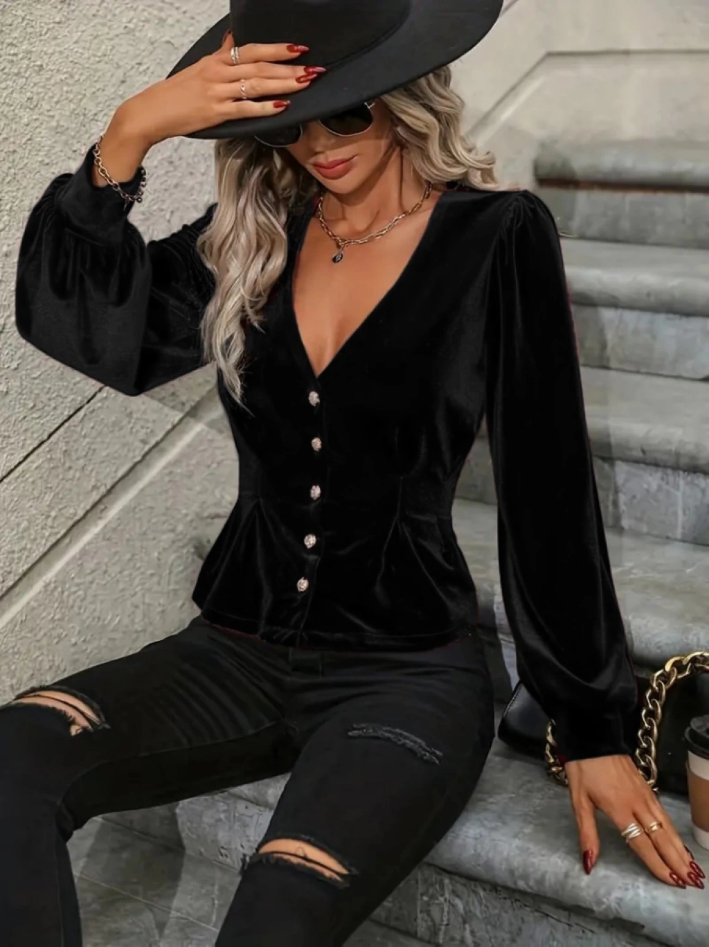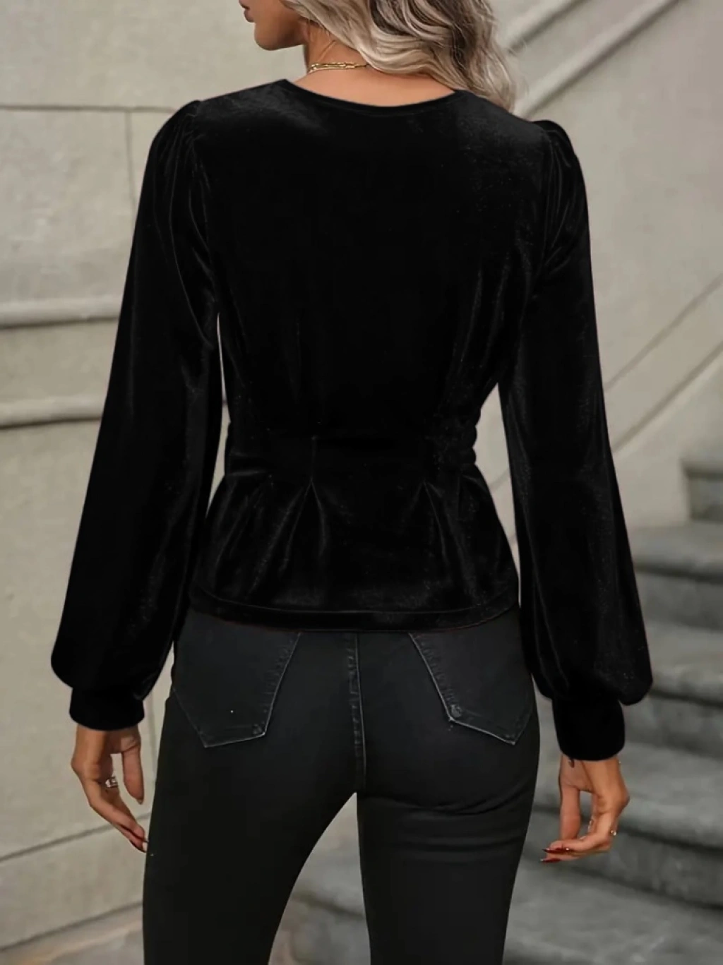 Kadın Uzun Kollu V Yakalı önden Düğmeli Kısa Kadife Bluz