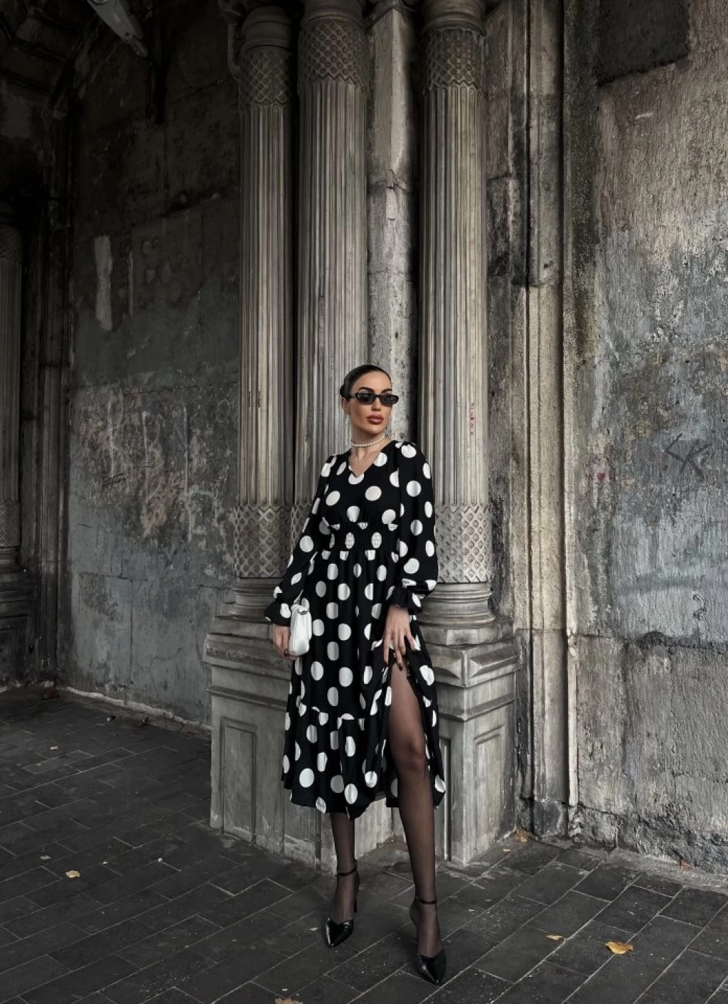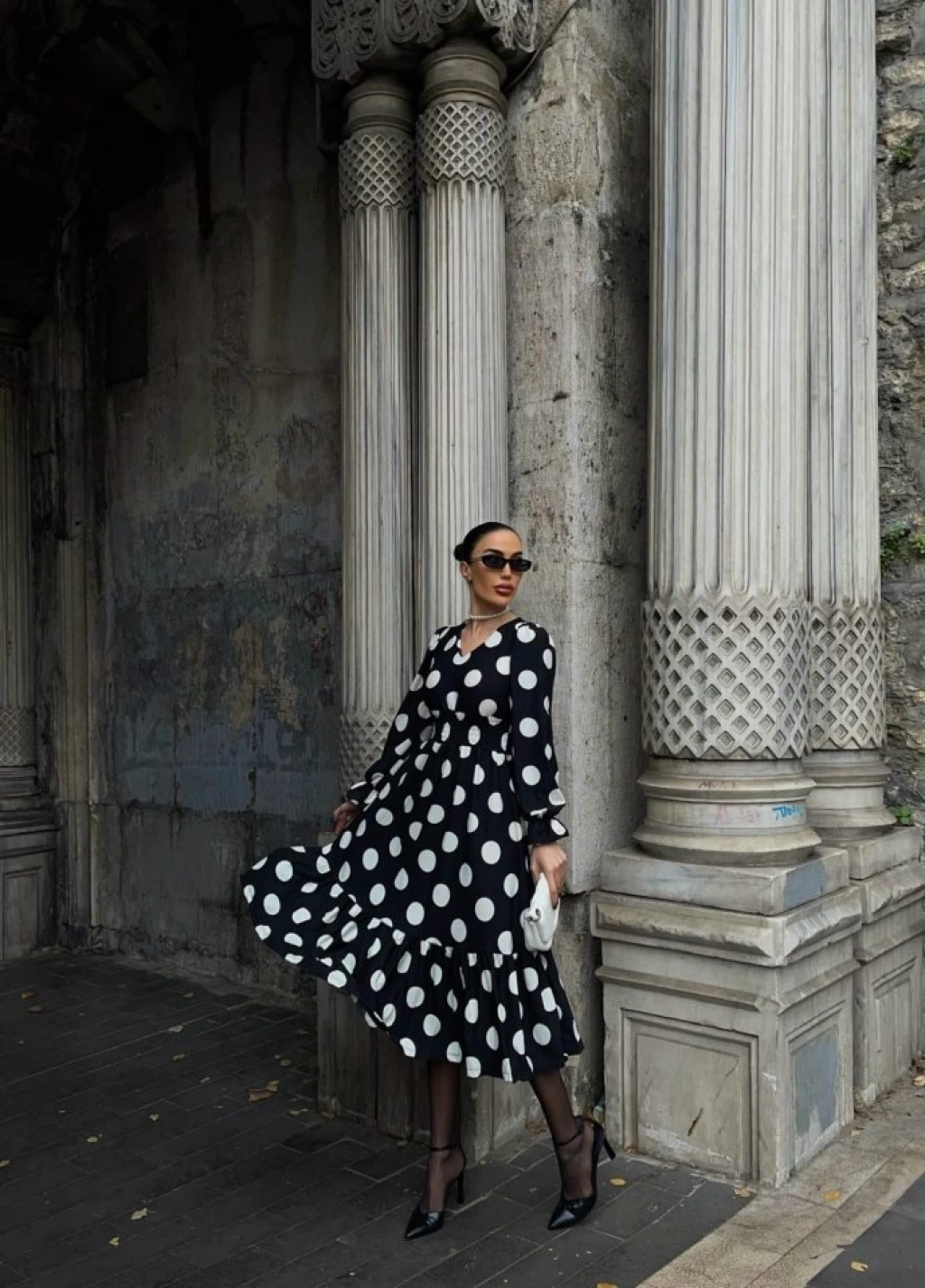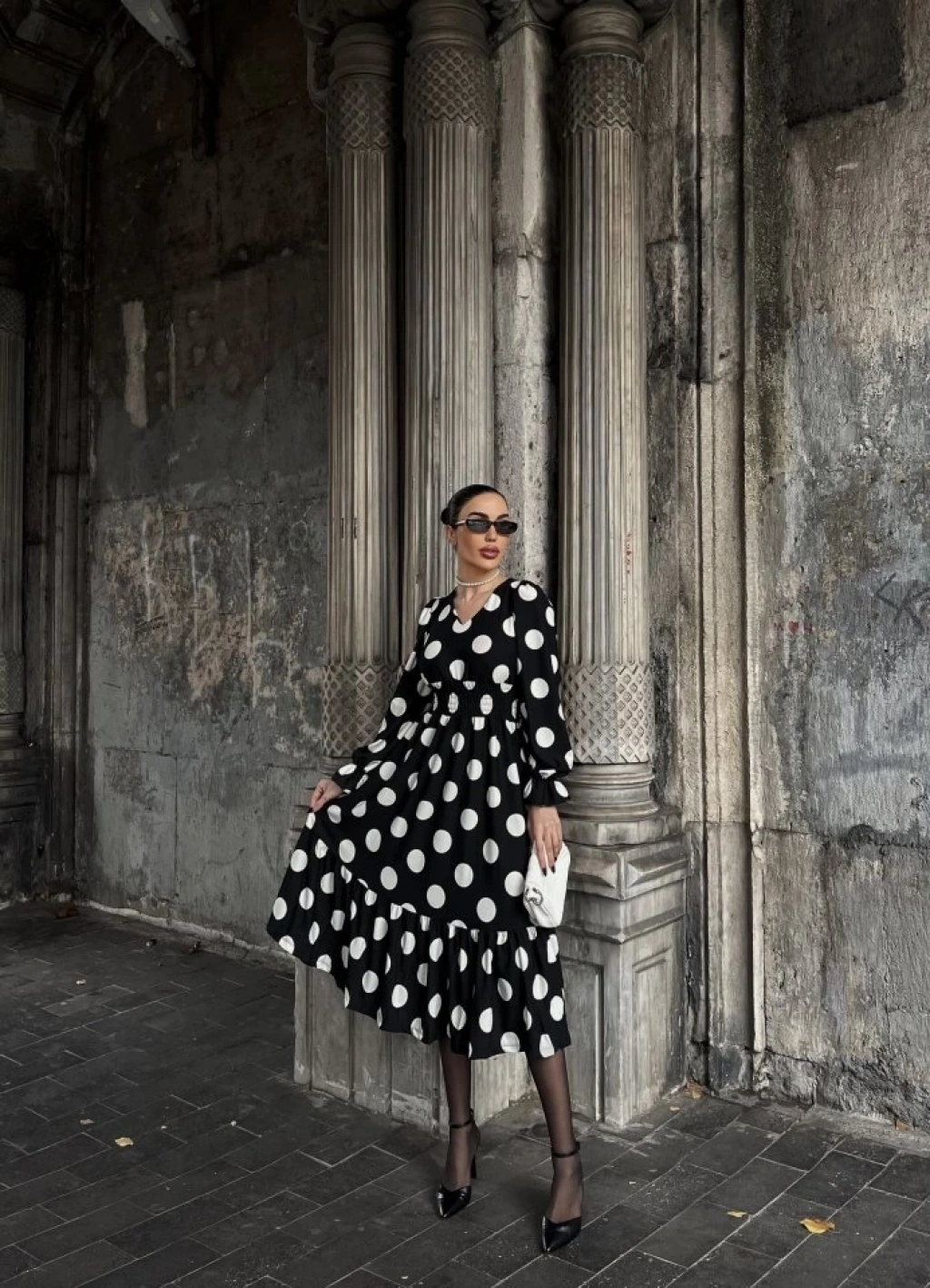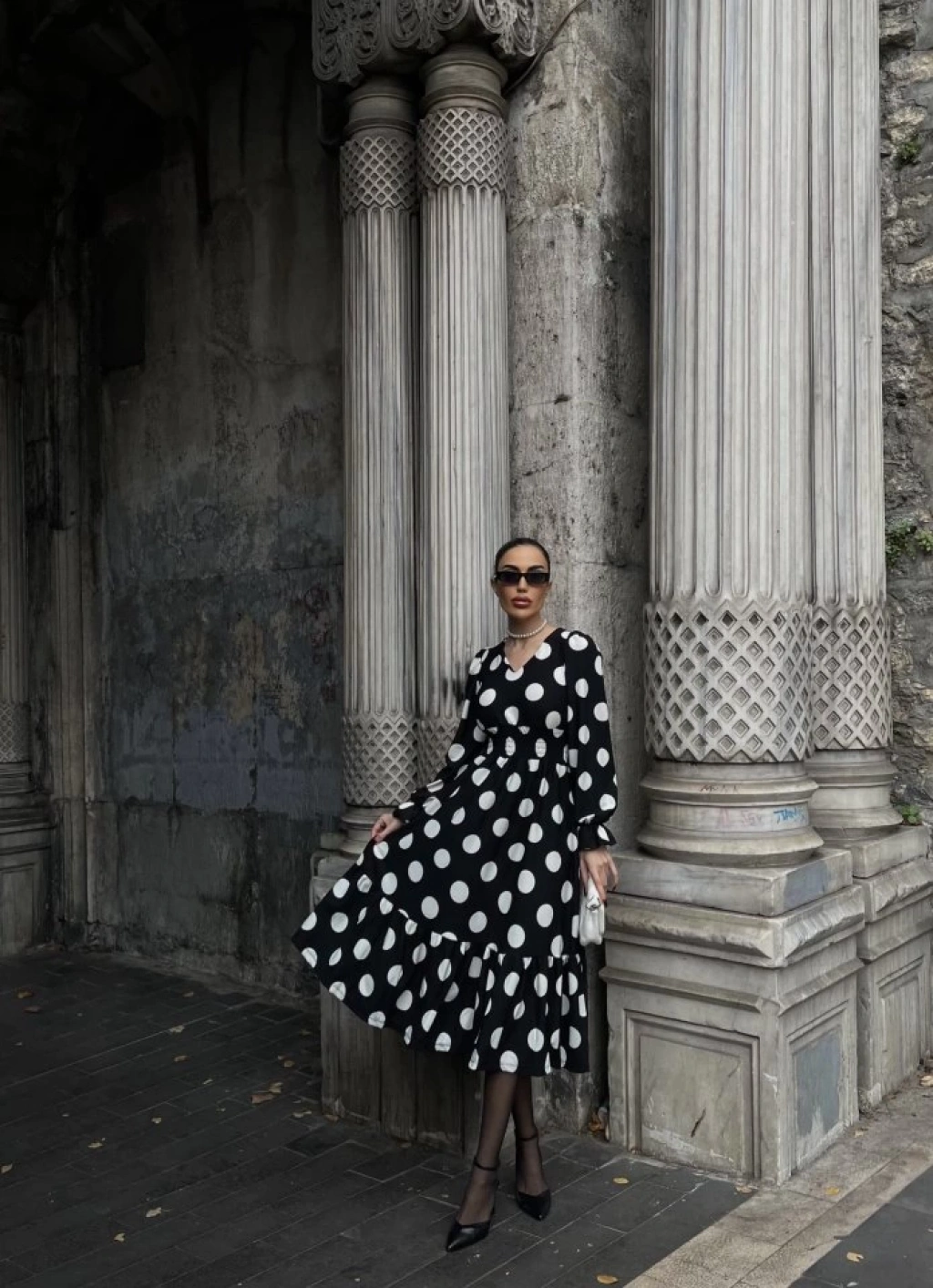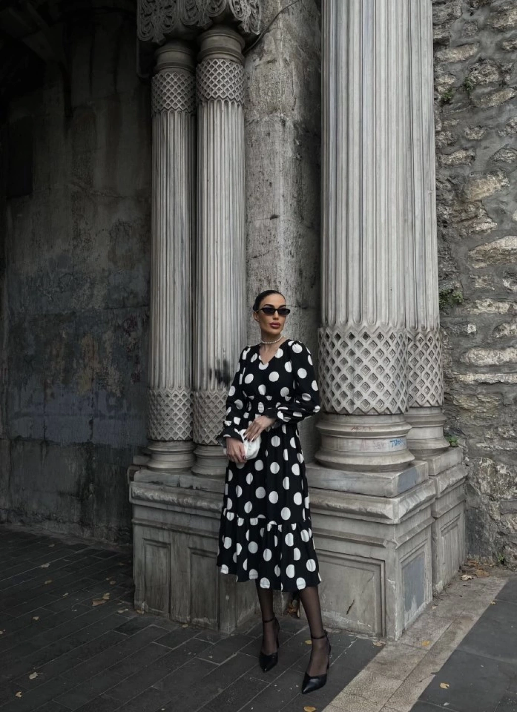 Kadın Uzun Kollu V Yakalı Beli Lastikli Puantiyeli Uzun Krep Elbise