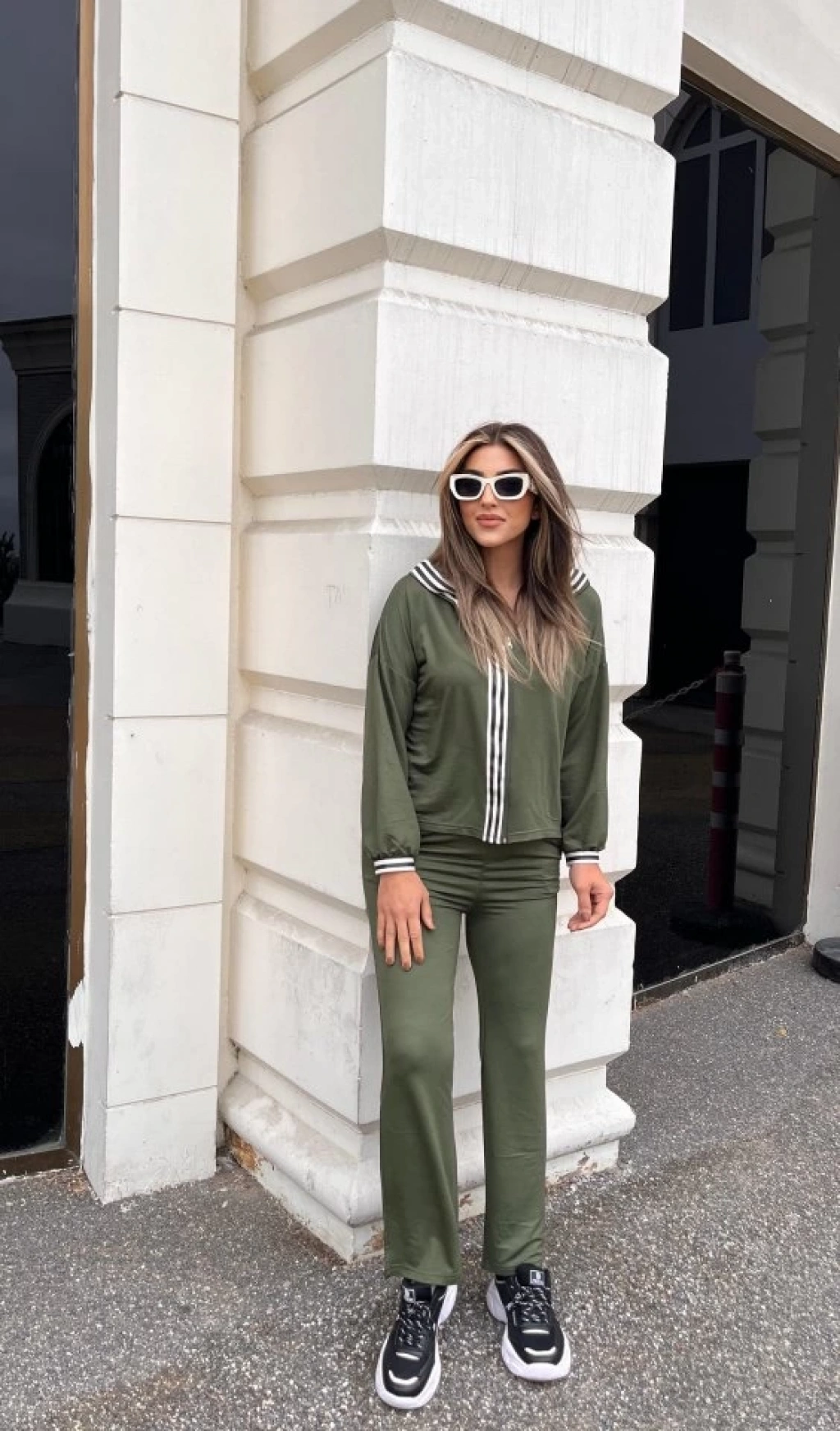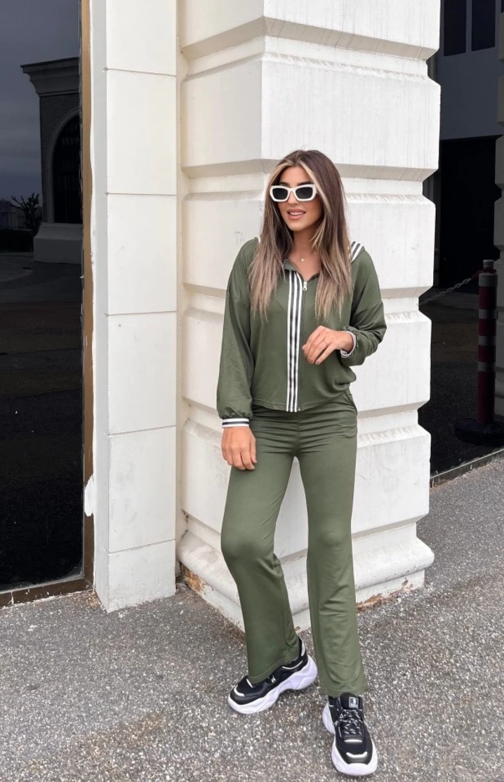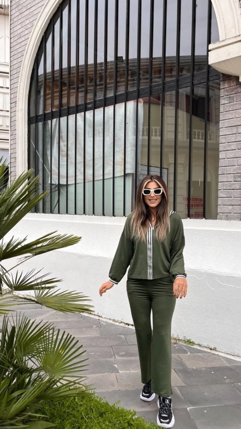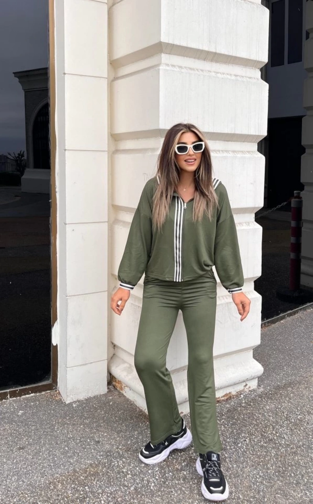 Kadın Uzun Kollu Kapşonlu önü Fermuarlı şerit Detay Viskon Iki Iplik Alt üst Ikili Takım