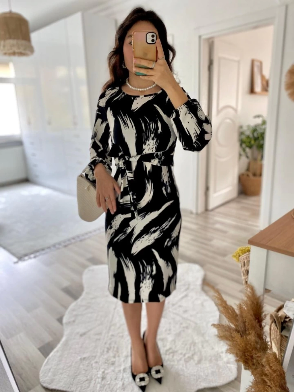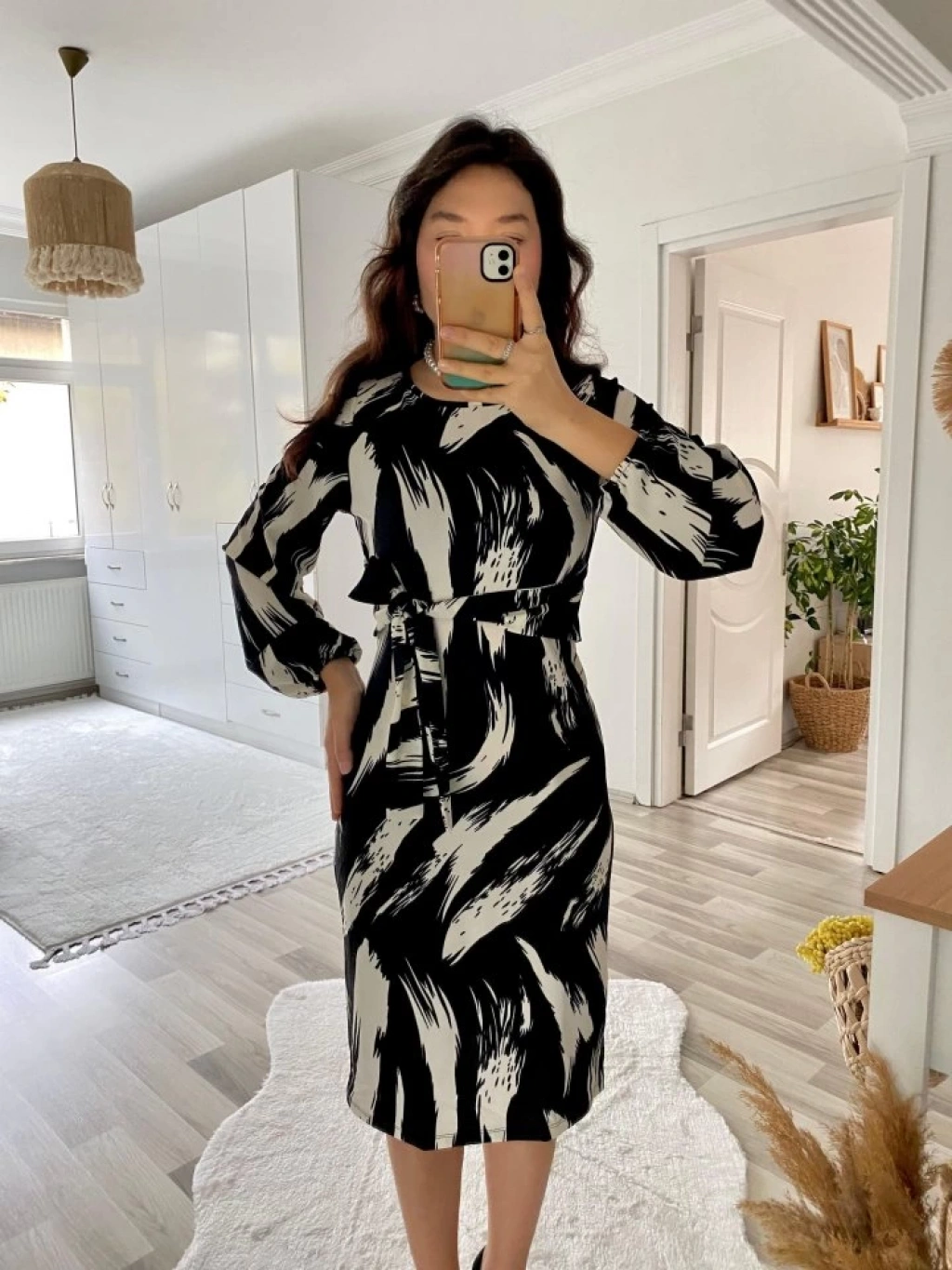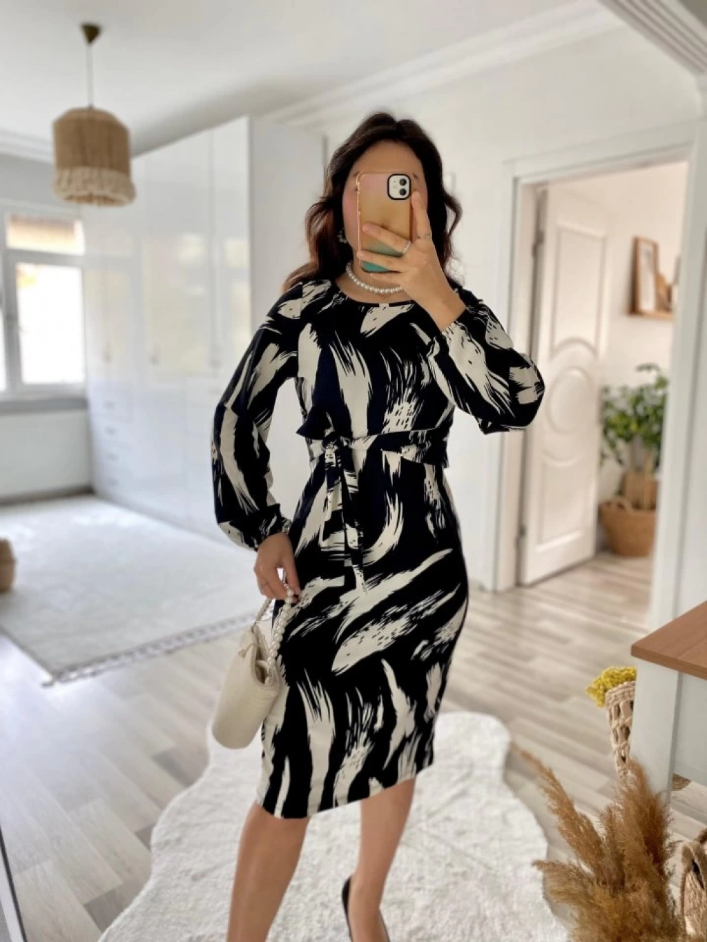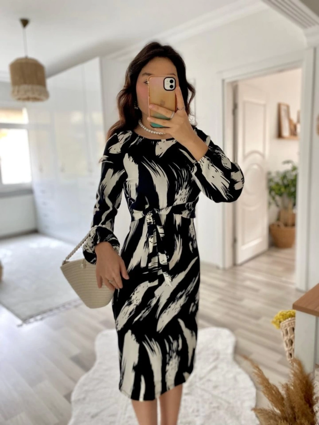 Kadın Uzun Kollu Yuvarlak Yaka Belden Kuşaklı Hazır Desenli Midi Krep Elbise