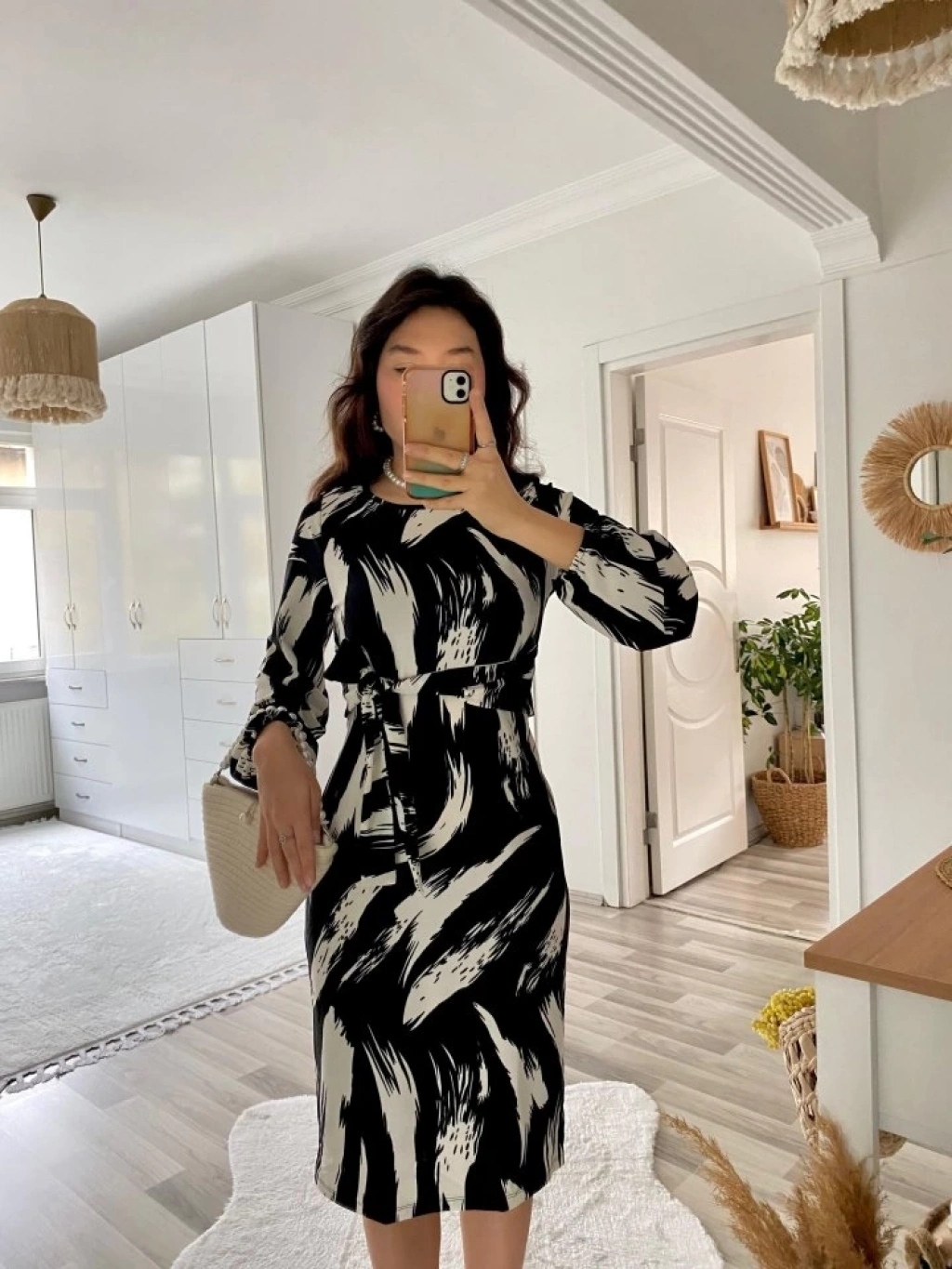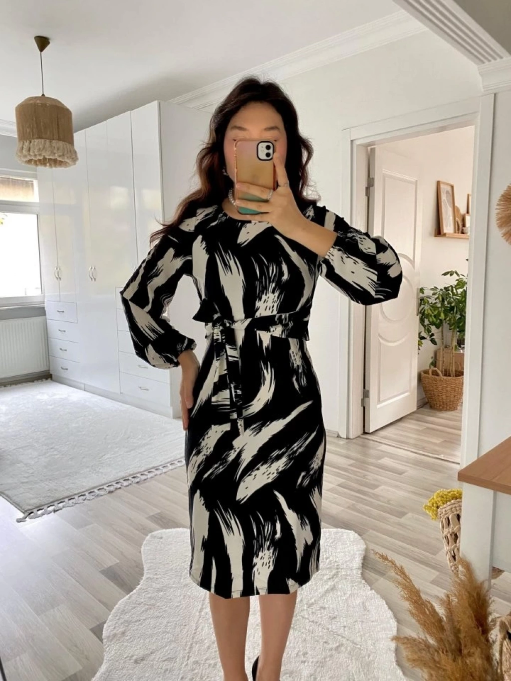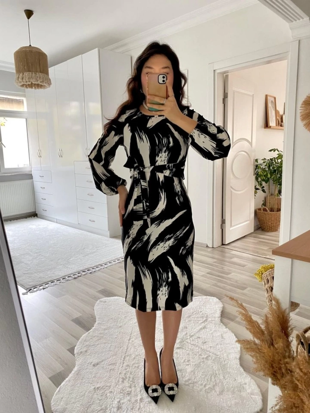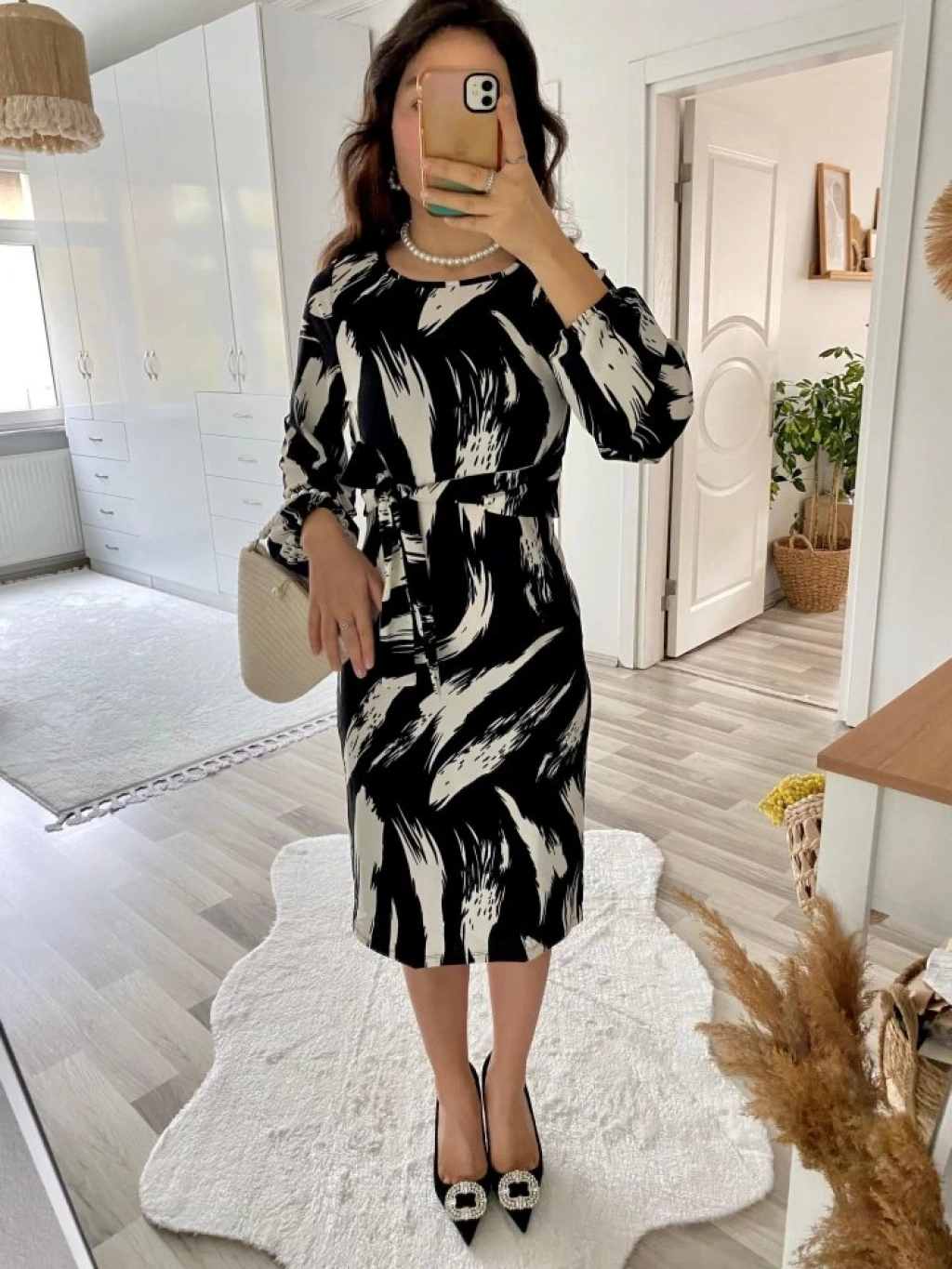 Kadın Uzun Kollu Yuvarlak Yaka Belden Kuşaklı Hazır Desenli Midi Krep Elbise