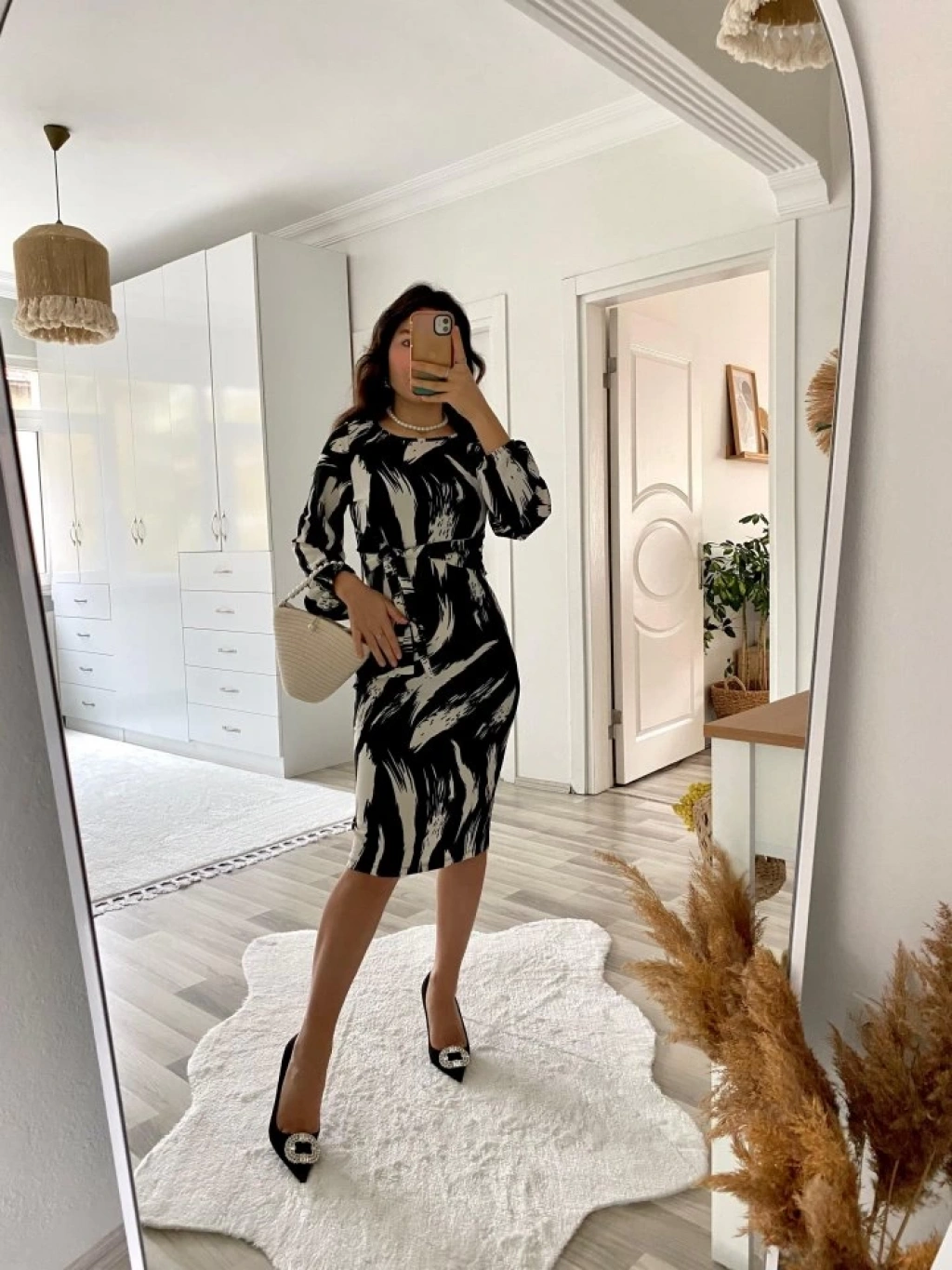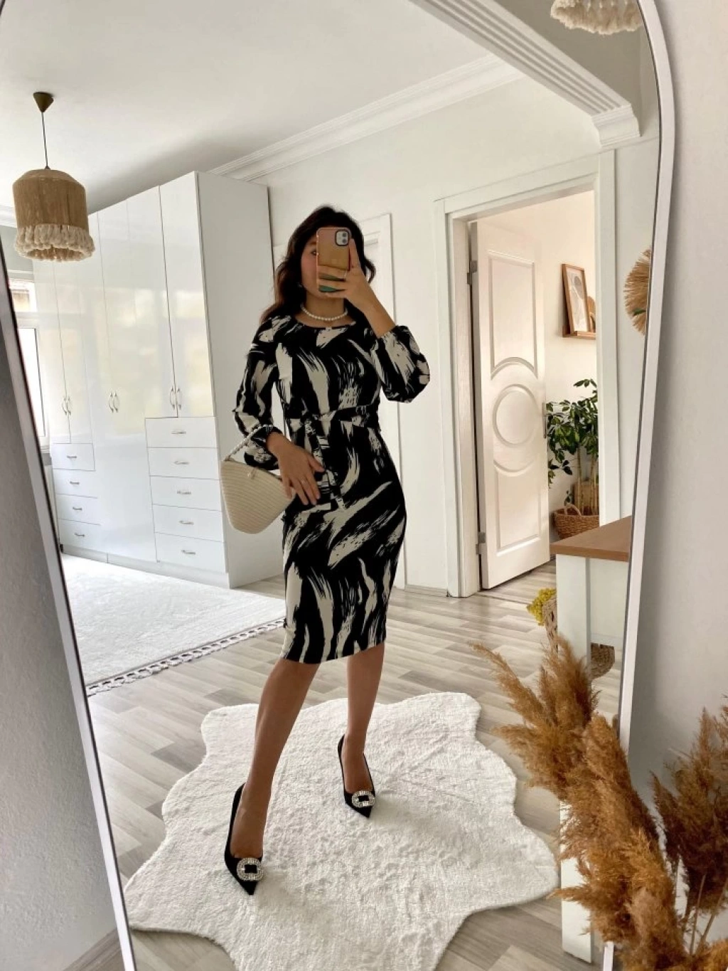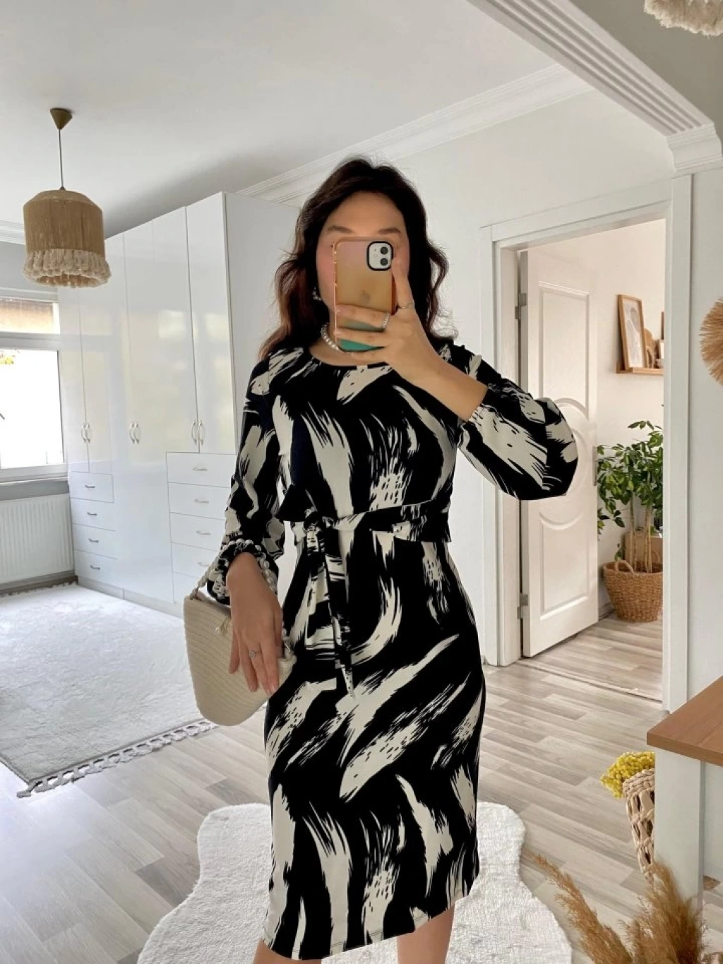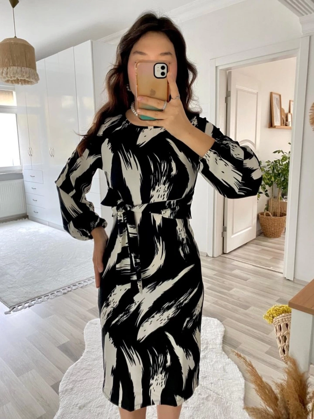 Kadın Uzun Kollu Yuvarlak Yaka Belden Kuşaklı Hazır Desenli Midi Krep Elbise
