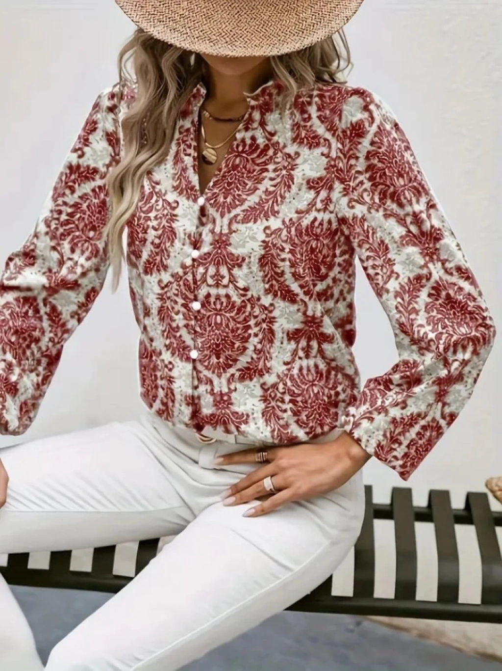 Kadın Uzun Kollu V Yakalı Desenli önü Düğmeli Ithal Keten Bluz