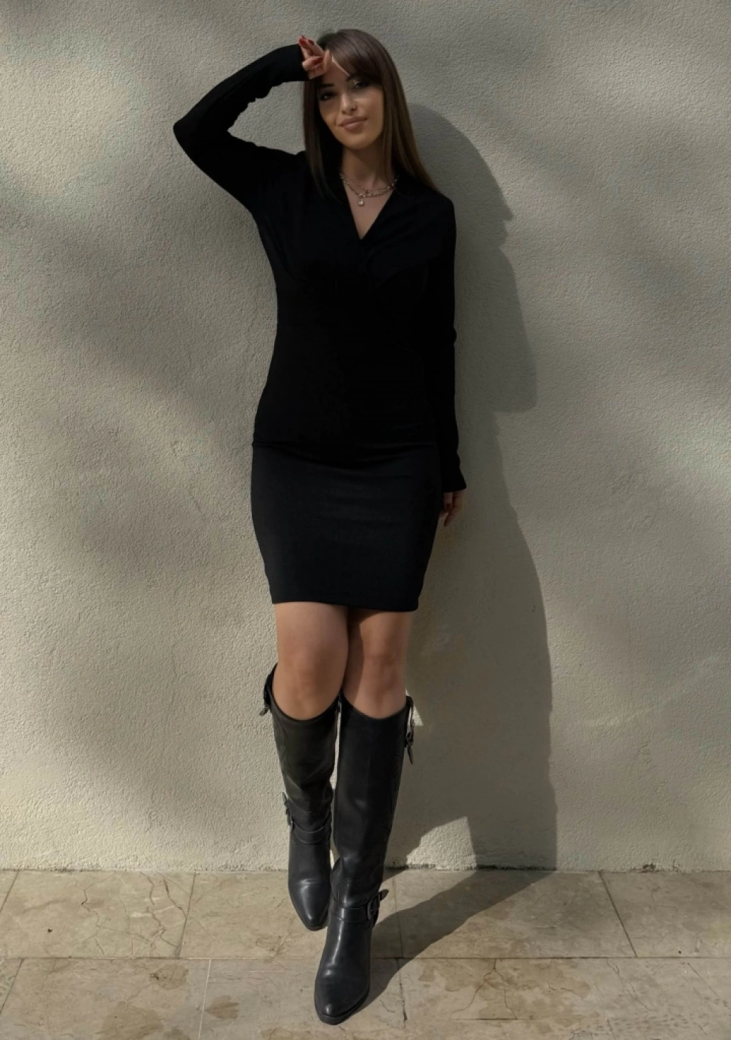 Kadın Uzun Kollu Kruvaze Yaka Krep Mini Boy Elbise