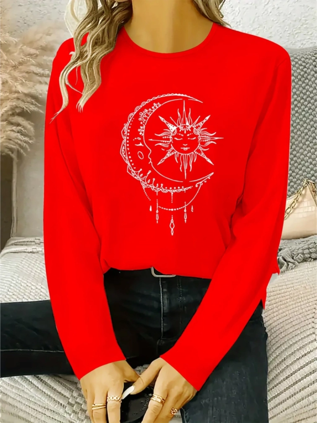 Kadın Uzun Kollu Bisiklet Yaka Ay Baskılı Viskon Bluz