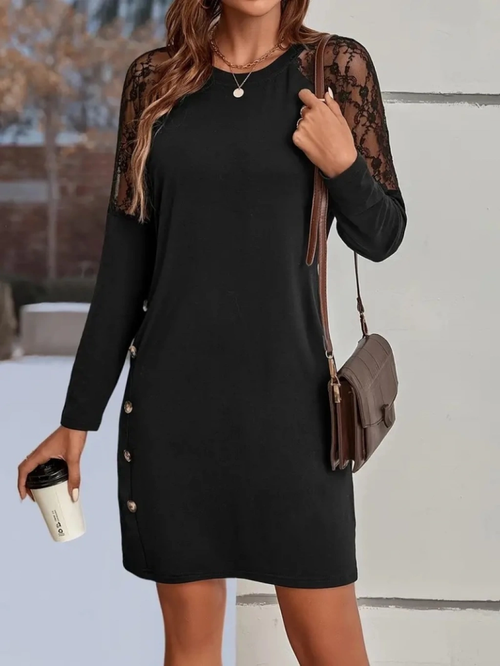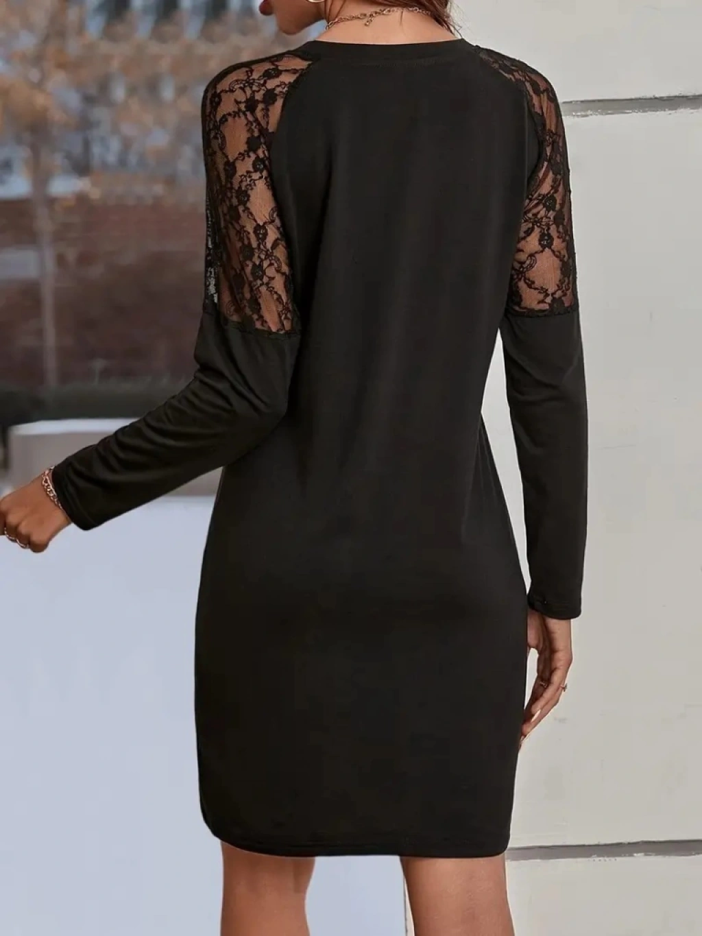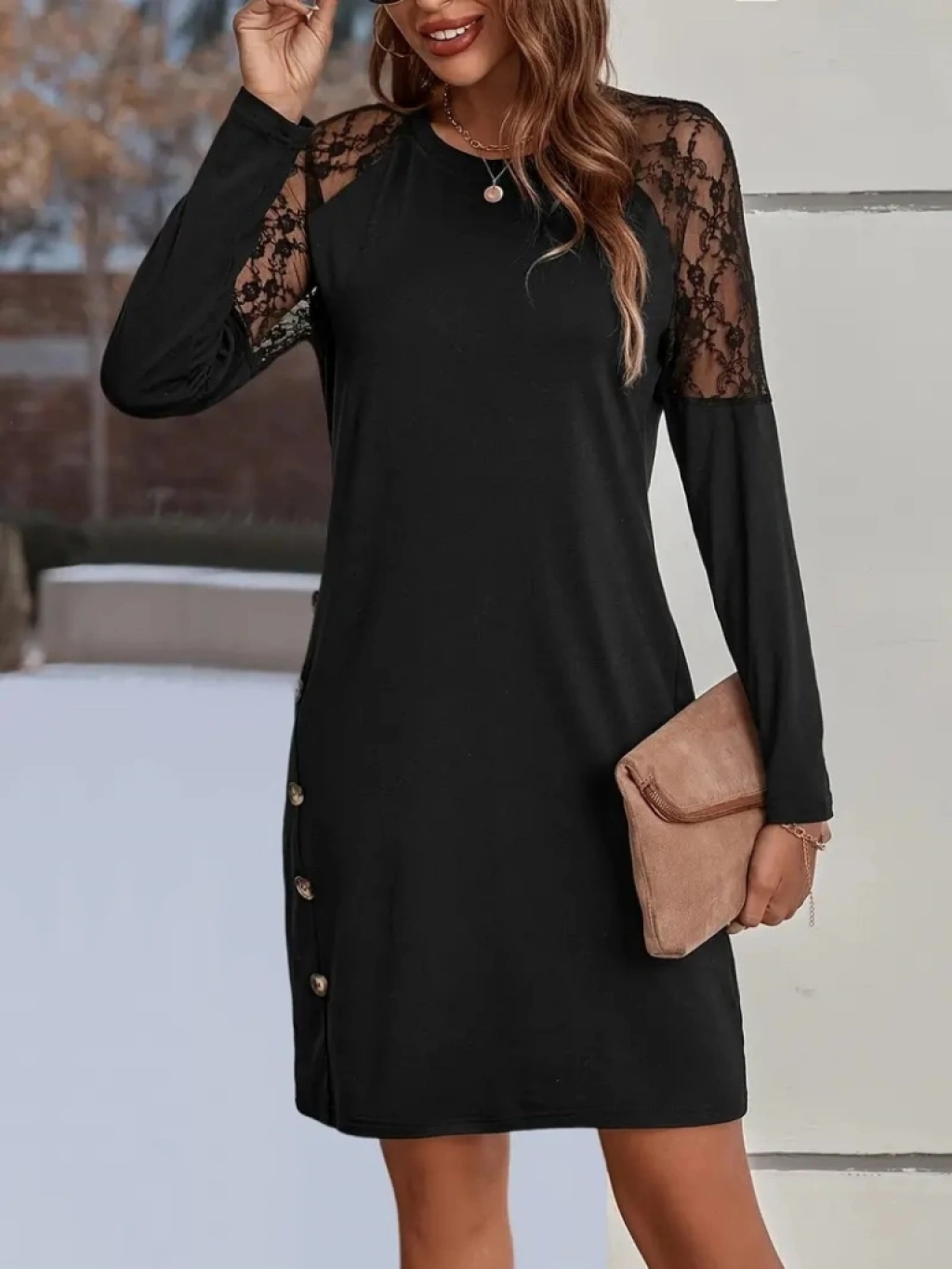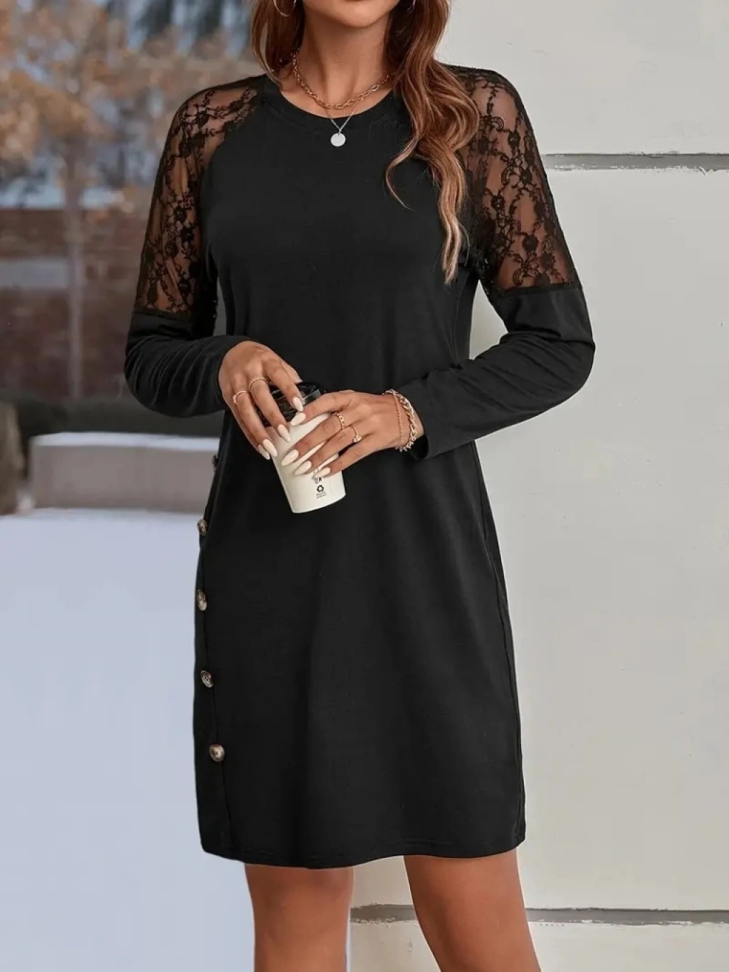 Kadın Uzun Kollu Kolları Dantelli Yuvarlak Yandan Düğme Detay Yaka Viskon Iki Iplik Elbise