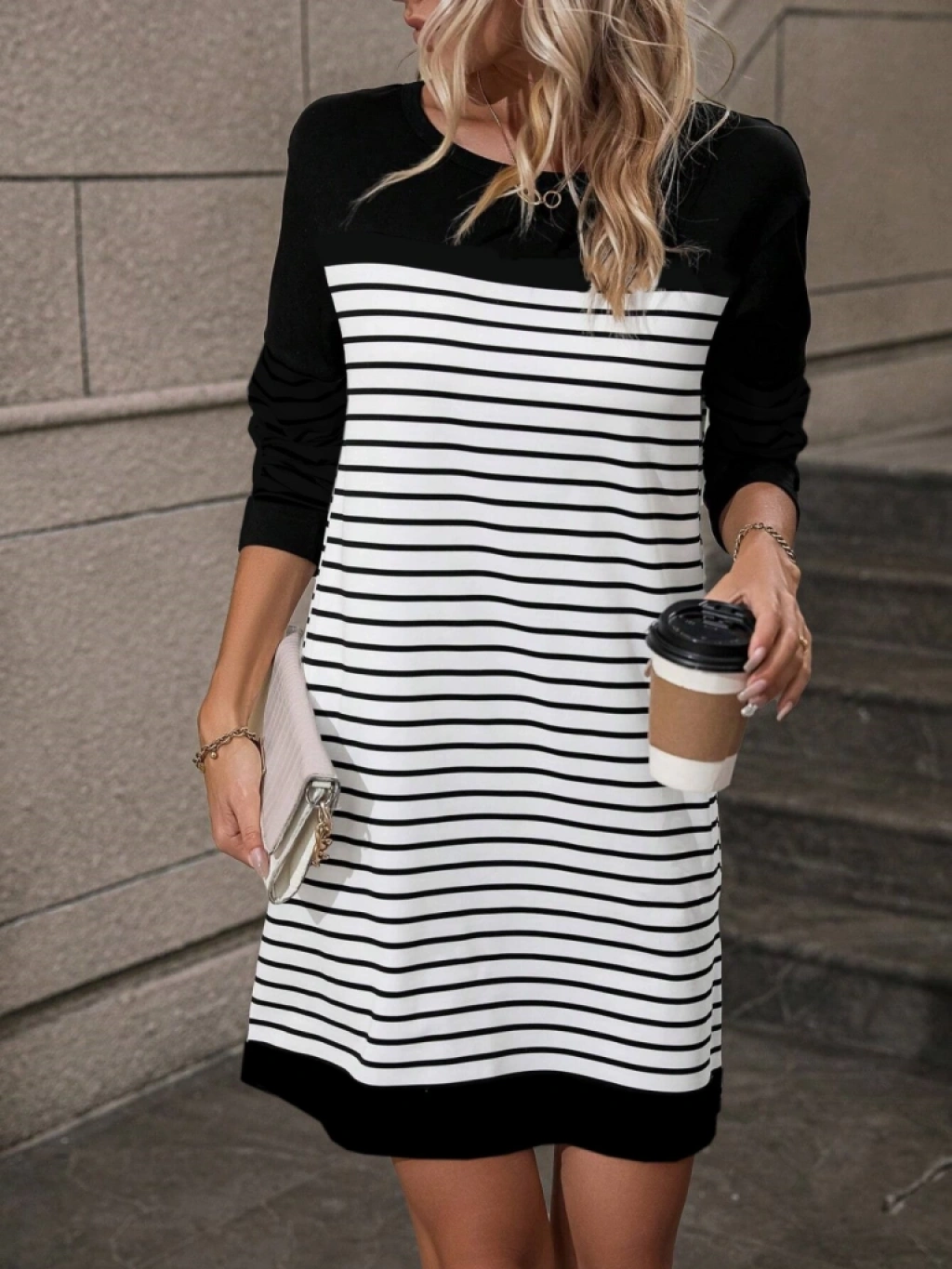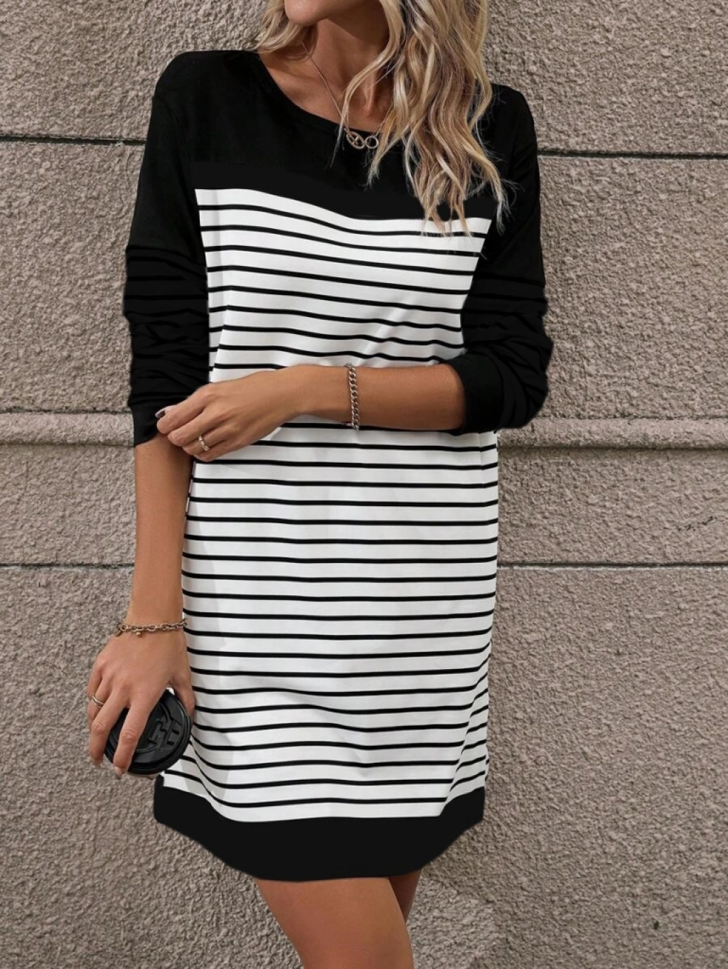 Kadın Bisiklet Yaka Uzun Kol çizgili Iki Iplik Kumaş Mini Boy Elbise
