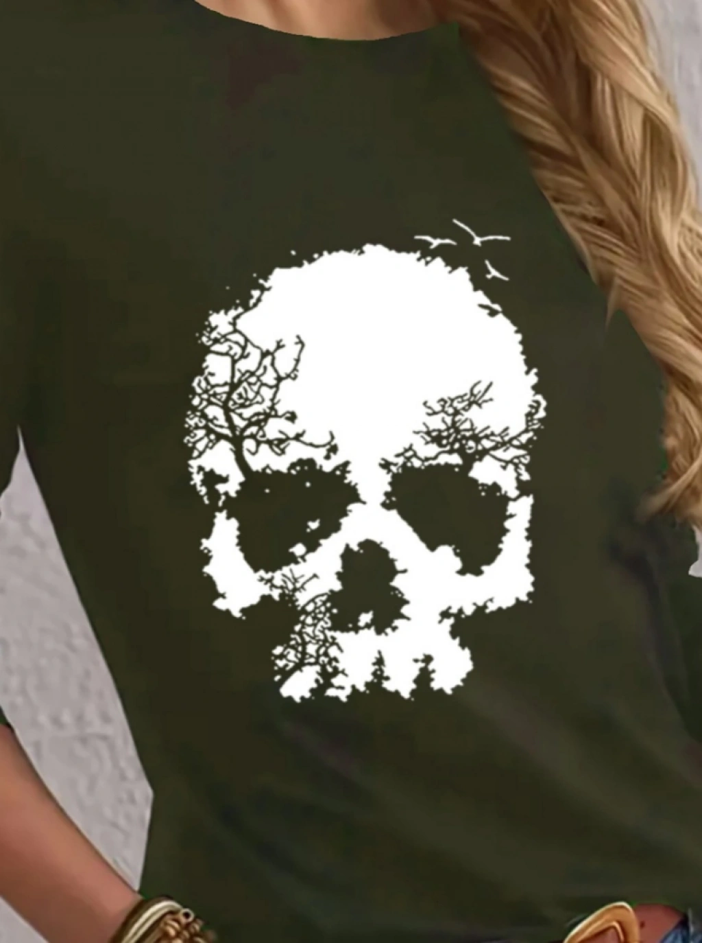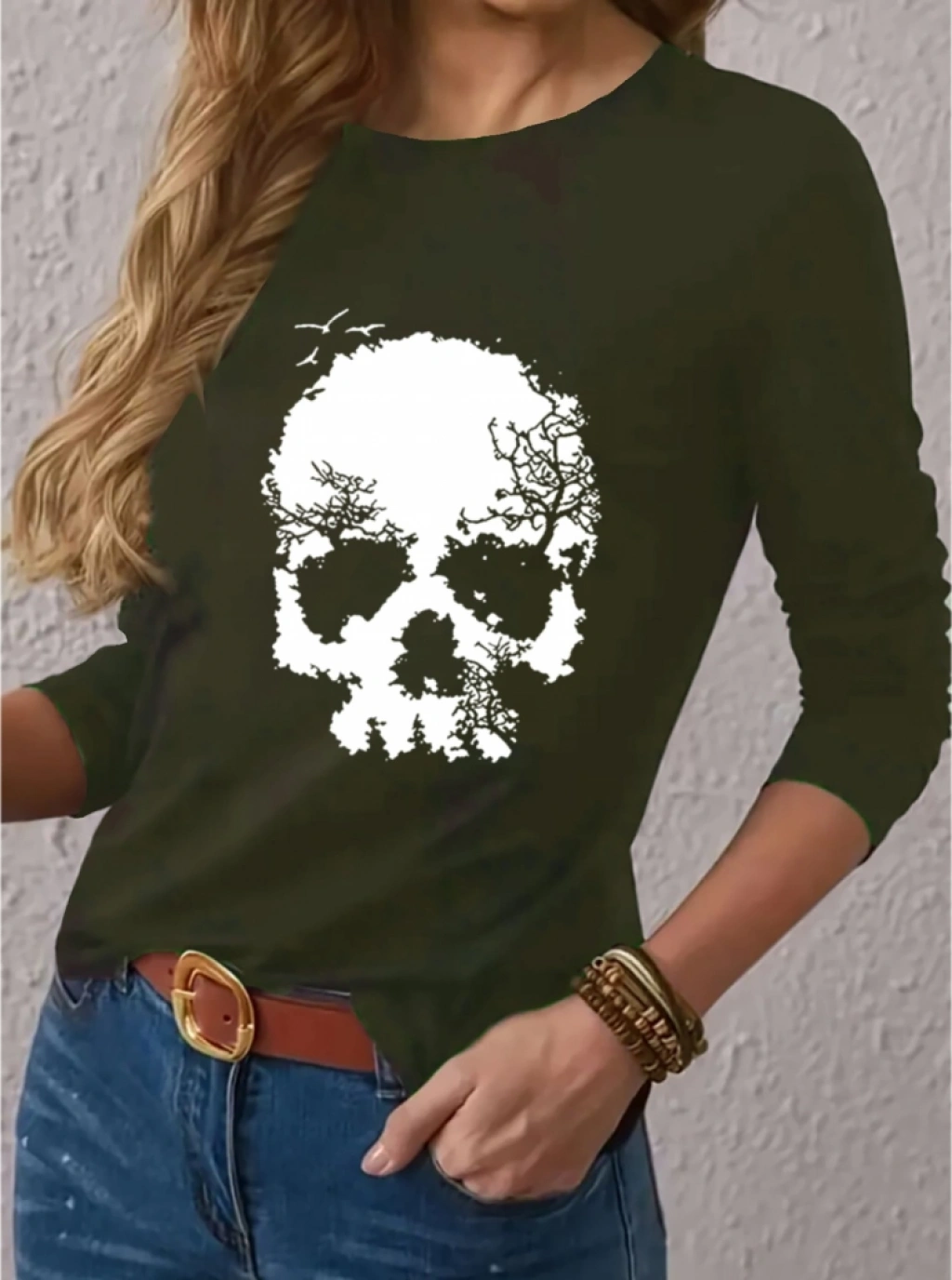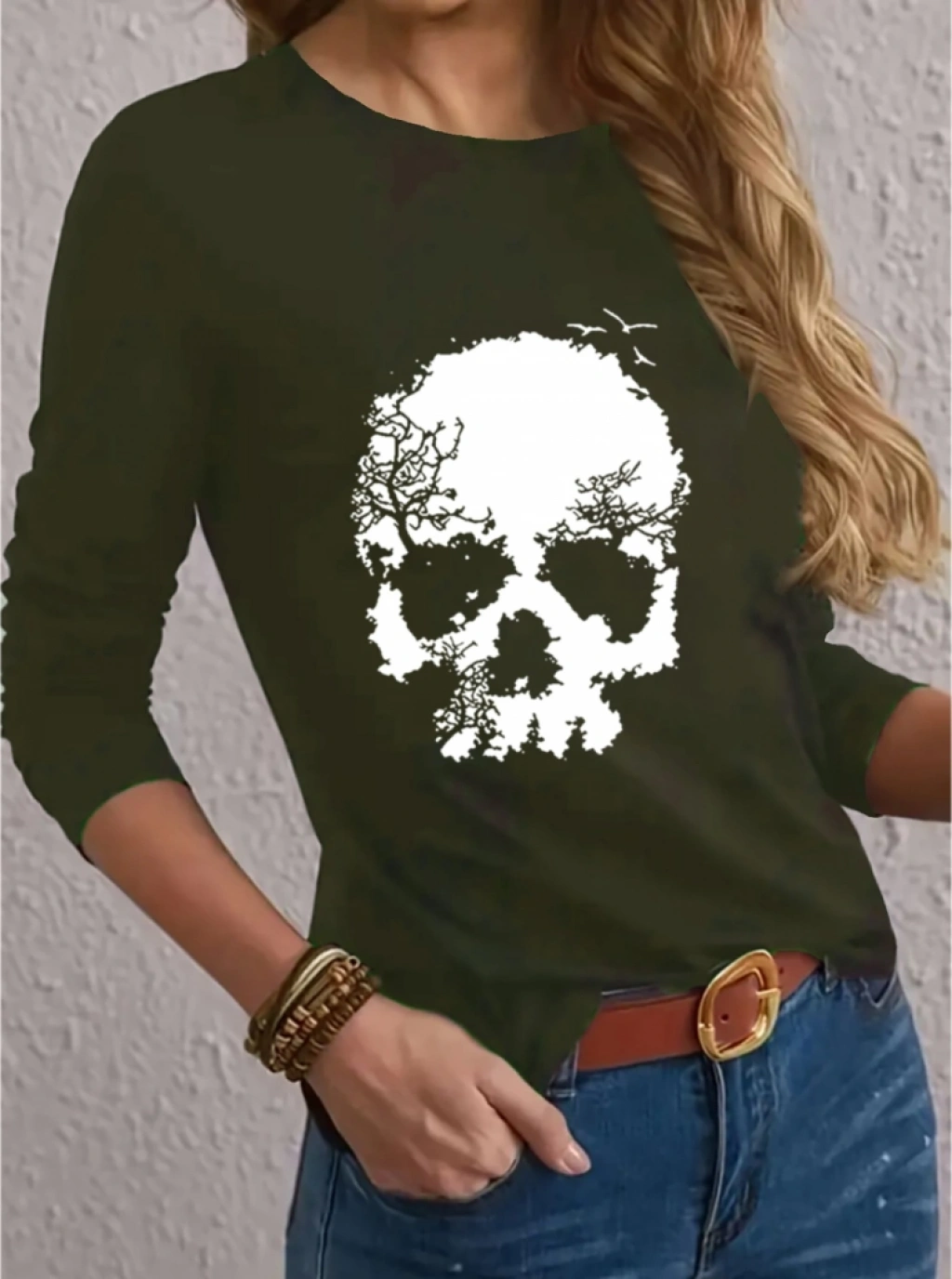 Kadın Uzun Kollu Bisiklet Yaka Kurukafa Desenli Viskon Bluz