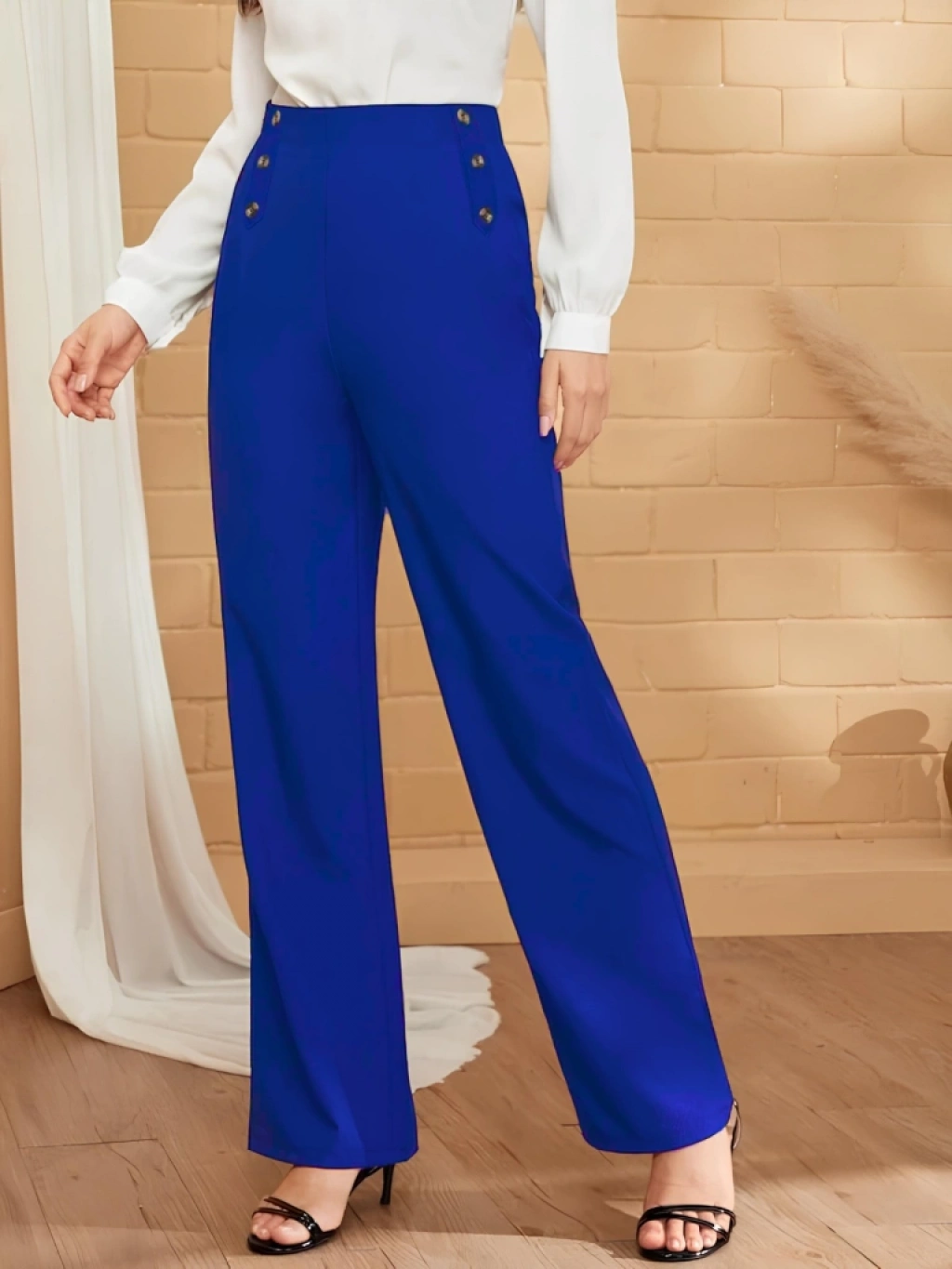 Kadın Düğme Detay Bol Paça Ithal Krep Pantolon
