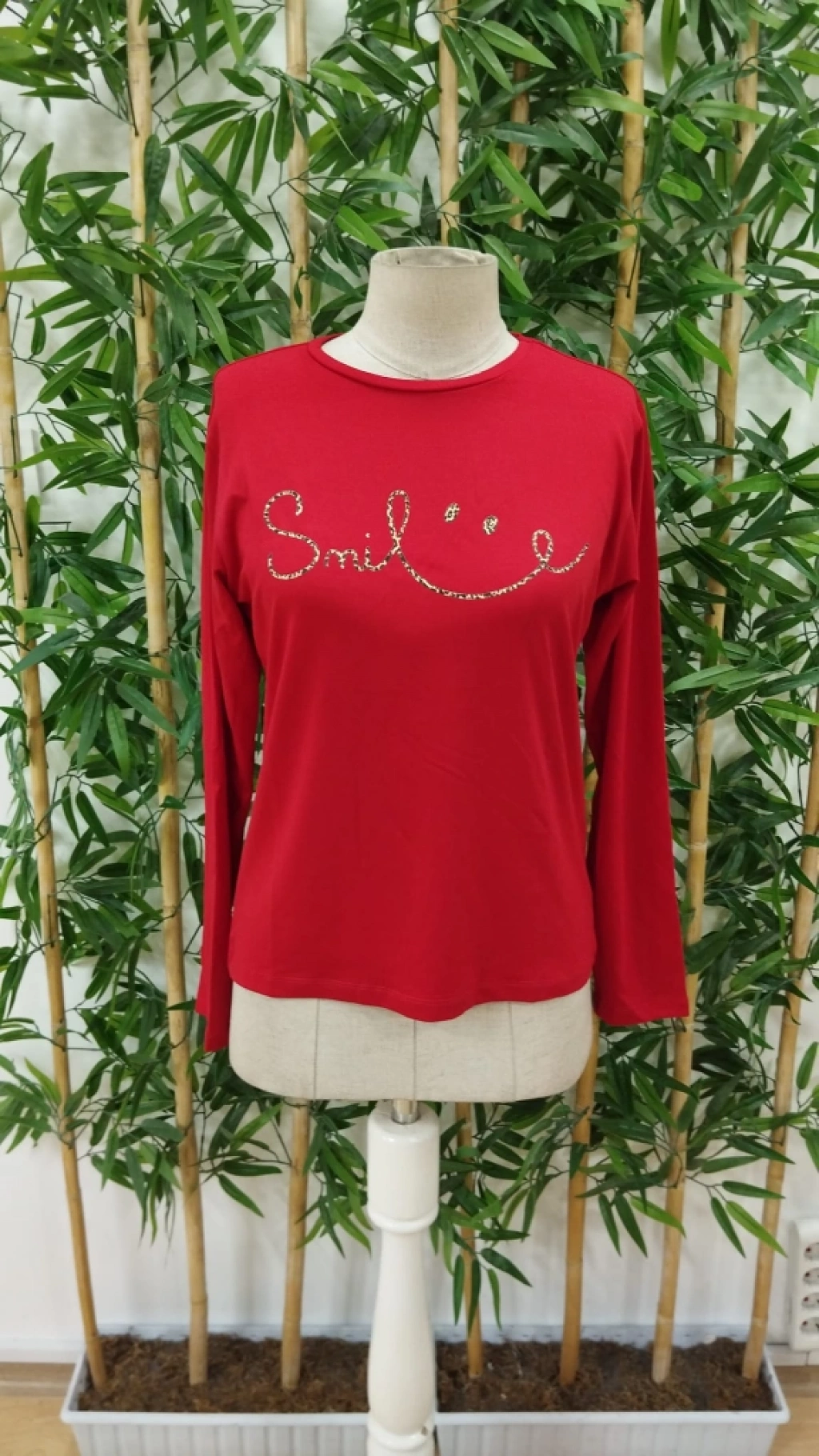 Kadın Uzun Kollu Bisiklet Yaka Gülümseyen Surat Desenli Viskon Bluz