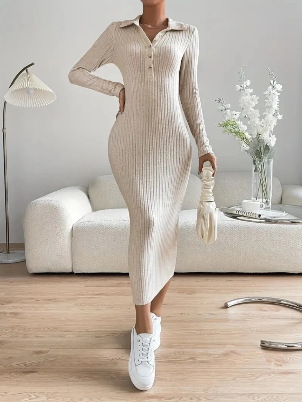 Kadın Uzun Kollu Yakalı Düğmeli şardonlu Kaşkorse Elbise