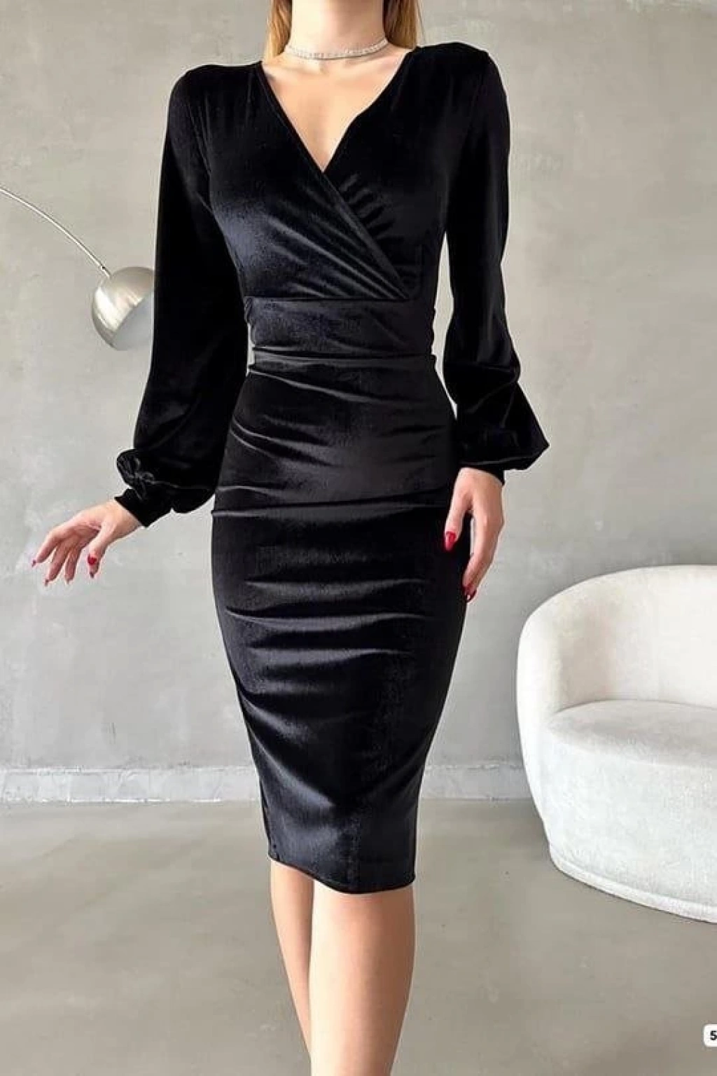 Kadın Kadife Kumaş Kruvaze Yaka Balon Kol Ve Yırtmaç Detaylı Midi Boy Elbise